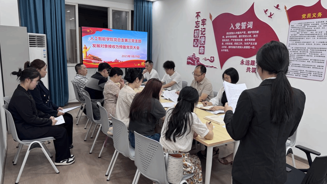为充分发挥基层党组织的战斗堡垒作用,增强凝聚力和战斗力,赓续和传承红色血脉,为党的事业培养更多优秀人才,2025年5月29日12:30,人工智能学院党总支第三党支部在信科楼303支部工作室组织召开接收预备党员大会。会议由支部书记吴勇帑主持,支部12名党员教师及3名发展对象参加。首先由发展对象发言,阐述对党的认识、入党动机、本人履历、家庭成员、主要社会关系及需要向党组织说明的有关情况,并从思想、学习、工作、生活等方面向全体党员进行汇报;...