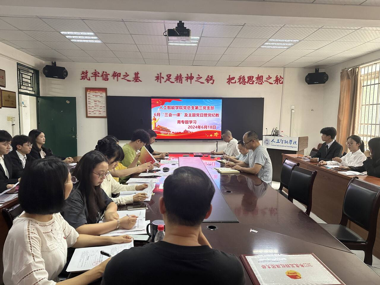 2023年6月13日,人工智能学院党总支第三党支部在信科楼507教室开展6月“三会一课”及主题党日学习。会议由支部书记吴勇帑主持,支部16名党员师生参加。 支部宣传委员蒲彦钧组织与会人员学习了中共中央关于在全党深入开展学习贯彻习近平新时代中国特色社会主义思想主题教育的意见、习近平总书记关于“以学增智”内涵的阐述、习近平总书记关于树立正确政绩观的重要论述、习近平总书记给中国农业大学科技小院同学的回信、习...