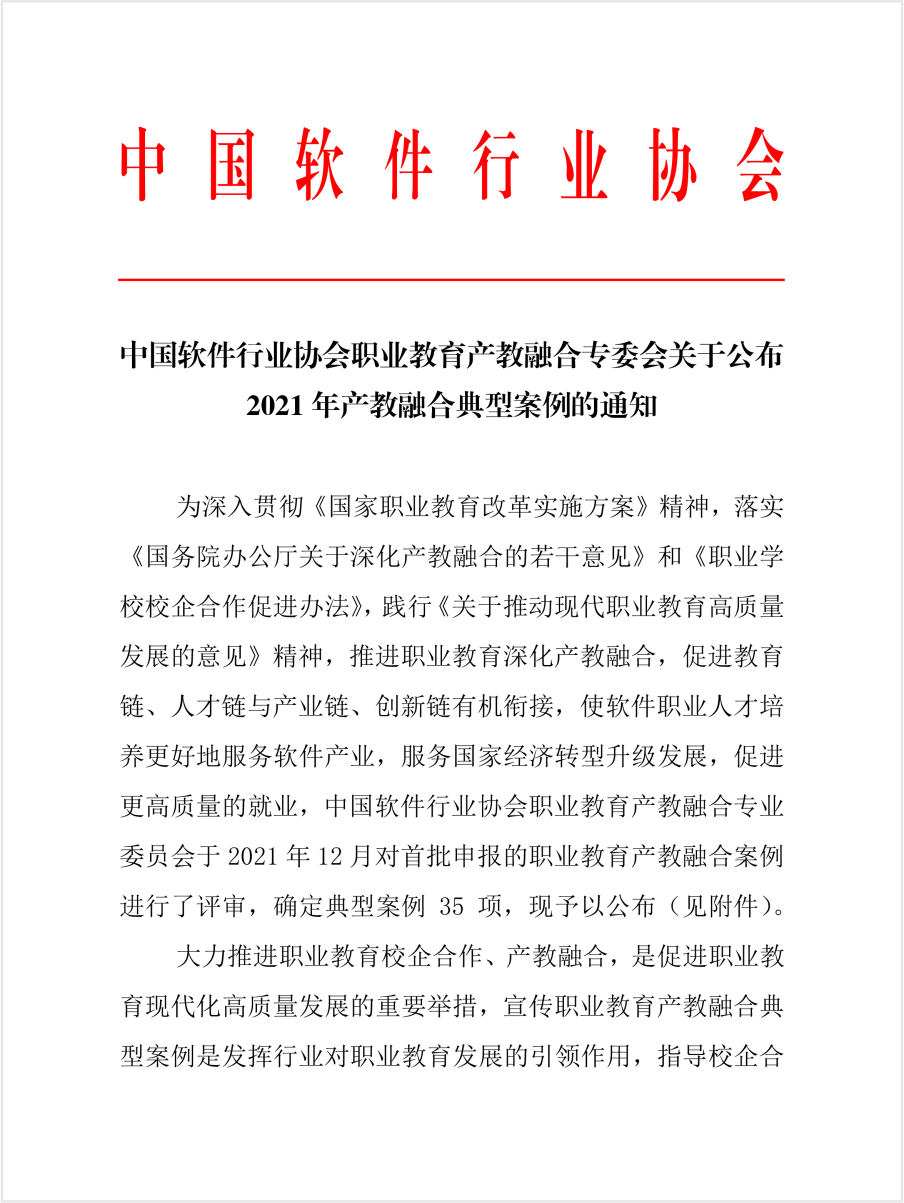 中国软件行业协会职业教育产教融合专业委员会于2021年11月在全国范围内组织了职业教育产教融合案例申报,12月对首批申报的案例进行评审,本次共评选出了优秀典型案例35项。其中,我校人工智能学院与北京华晟经世合作的《产教融合背景下计算机类专业课程体系改革研究与实践》典型案例入选。