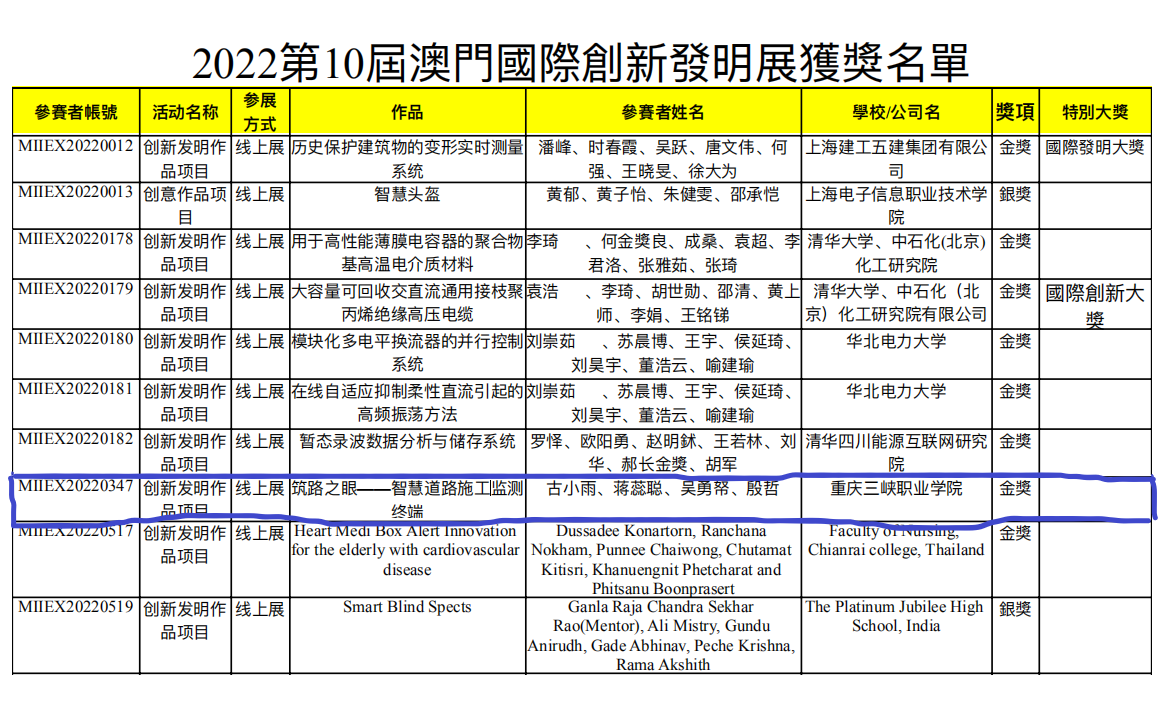 2022年10月13日-2022年10月15日,第十届澳门国际创新发明展在澳门科学馆举办,由物联网应用技术专业教师团队吴勇帑、阳鹏、蒲彦钧、殷哲老师指导,大数据技术专业群学生古小雨、蒋蕊聪的创新项目《筑路之眼——智慧道路施工监测终端》参加了本次创新发明展的线上展评并获得金奖。
