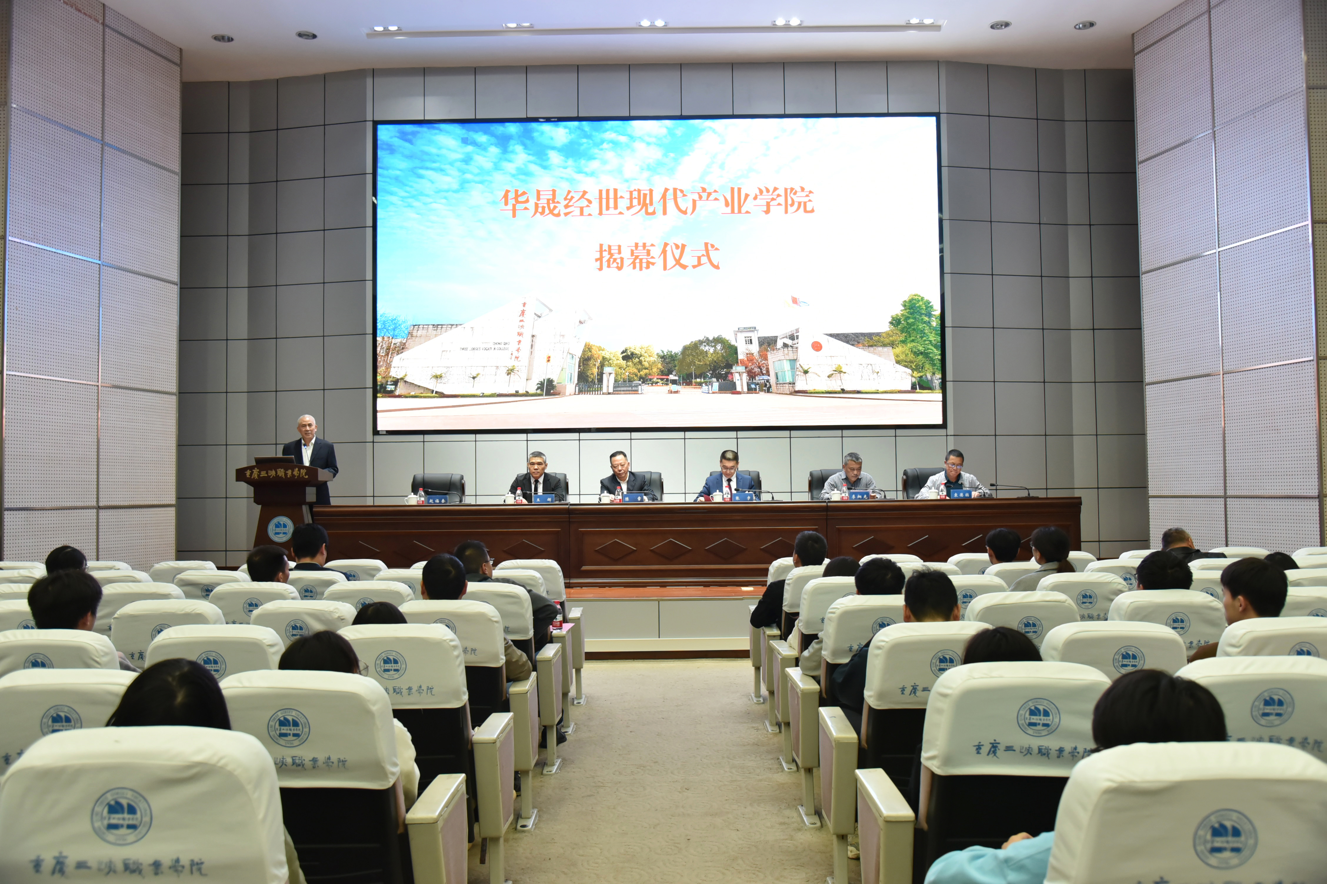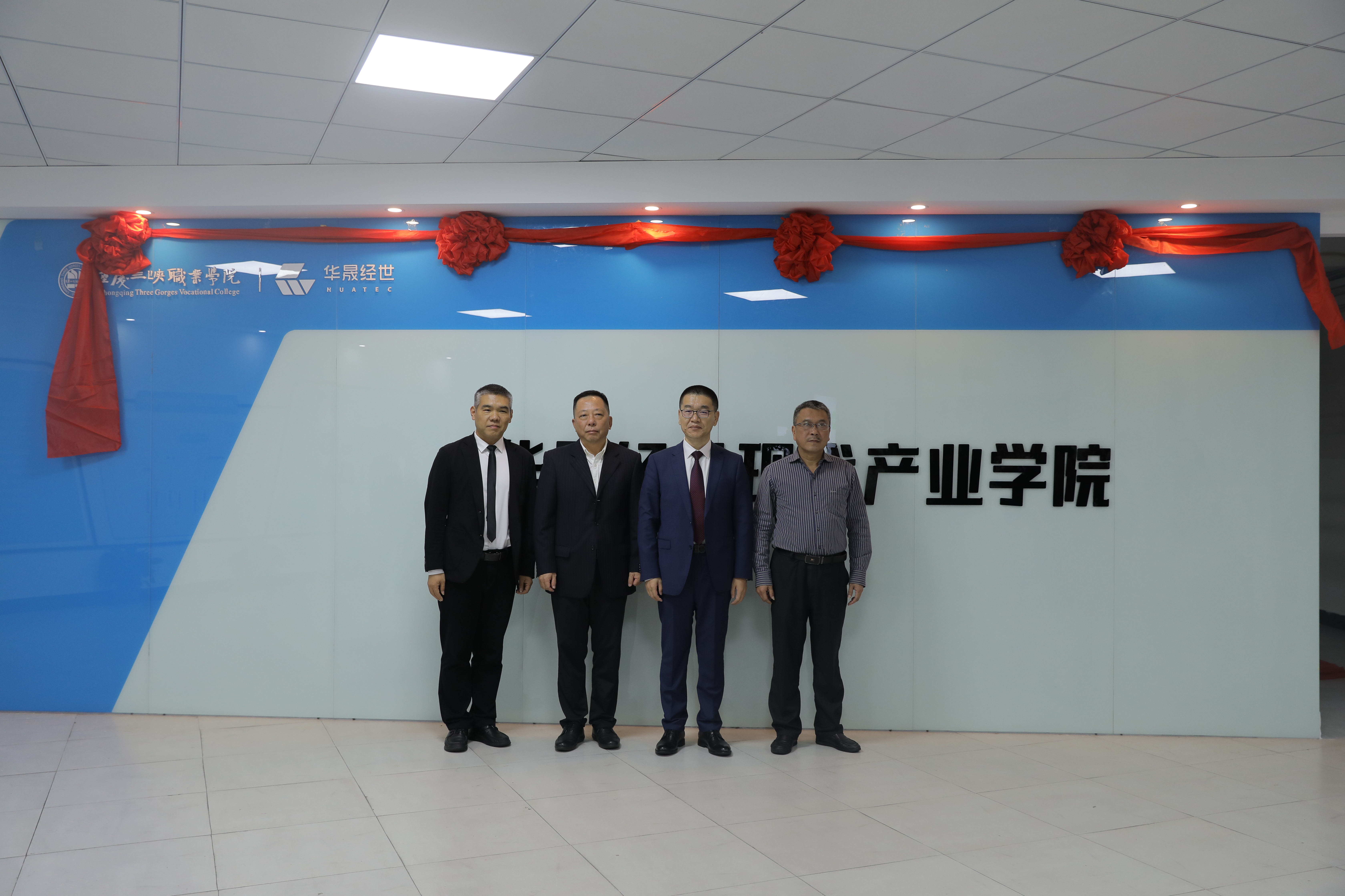 学校党委书记陈章、院长李炯光、华晟经世经总裁张宇、运营事业部总经理王辉共同为“华晟经世现代产业学院”揭幕,并宣布现代产业学院正式成立。