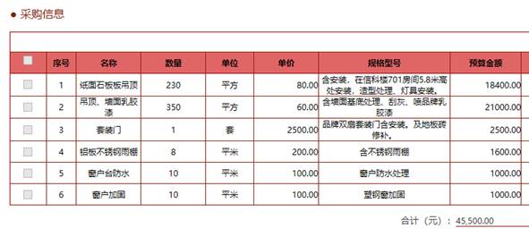 一、采购项目名称及数量 (项目总预算:45500.00 元肆万伍仟伍佰元整)。所有货物供方送货上门,按图纸安装完成后由需方验收。(施工安全问题与需方无关)。