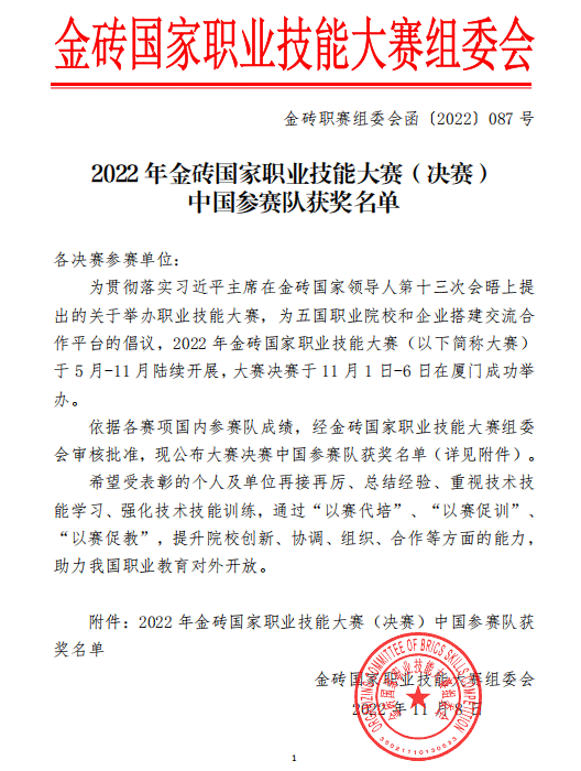 11月6日,2022年金砖国家职业技能大赛(决赛)在厦门落下帷幕。经过激烈角逐,人工智能学院2020级云计算技术应用专业学生汤鬆蔚获得云计算赛项三等奖。
