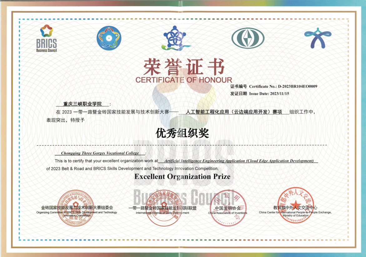 2023年11月14日我院人工智能技术应用专业杨鉴老师指导的雷旭同学参加2023 一带一路暨金砖国家技能发展与技术创新大赛之人工智能工程化应用(云边端应用开发)赛项国内赛决赛获全国二等奖,杨鉴老师获评优秀指导教师,学院获优秀组织奖。