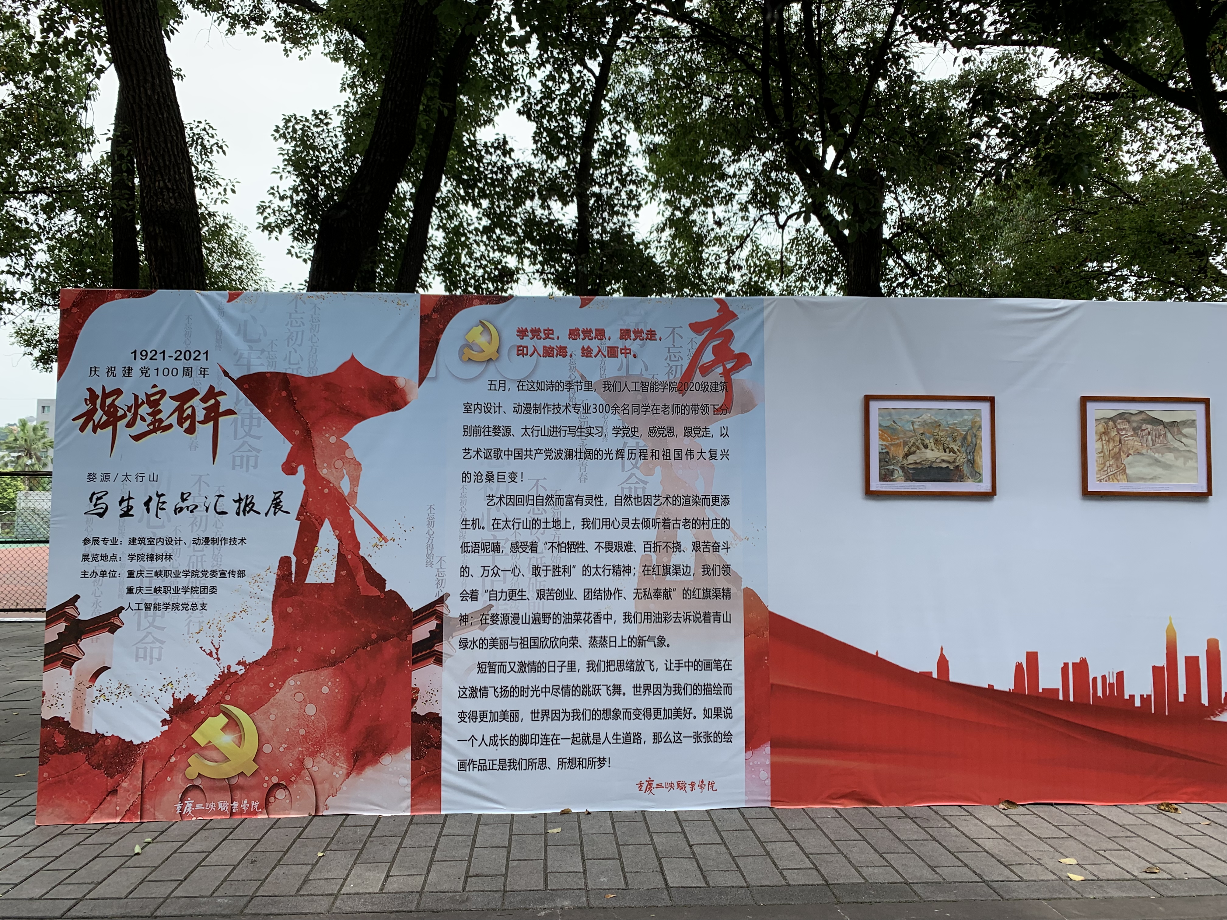 ——人工智能学院党总支开展庆祝建党辉煌百年写生作品汇报展 学党史,感党恩,跟党走,印入脑海,汇入画中。以艺术形式开展党史学习教育学习,讴歌中国共产党波澜壮阔的光辉历程和祖国伟大复兴的沧桑之变。2021年6月15日-6月18日,人工智能学院党总支在学校樟树林开展庆祝建党辉煌百年,2020级建筑室内设计和动漫制作技术专业学生写生作品汇报展。本次写生作品汇报展得到学校宣传部和团委的大力支持,展出写生作品300余幅,其中红色写生作品40幅。...