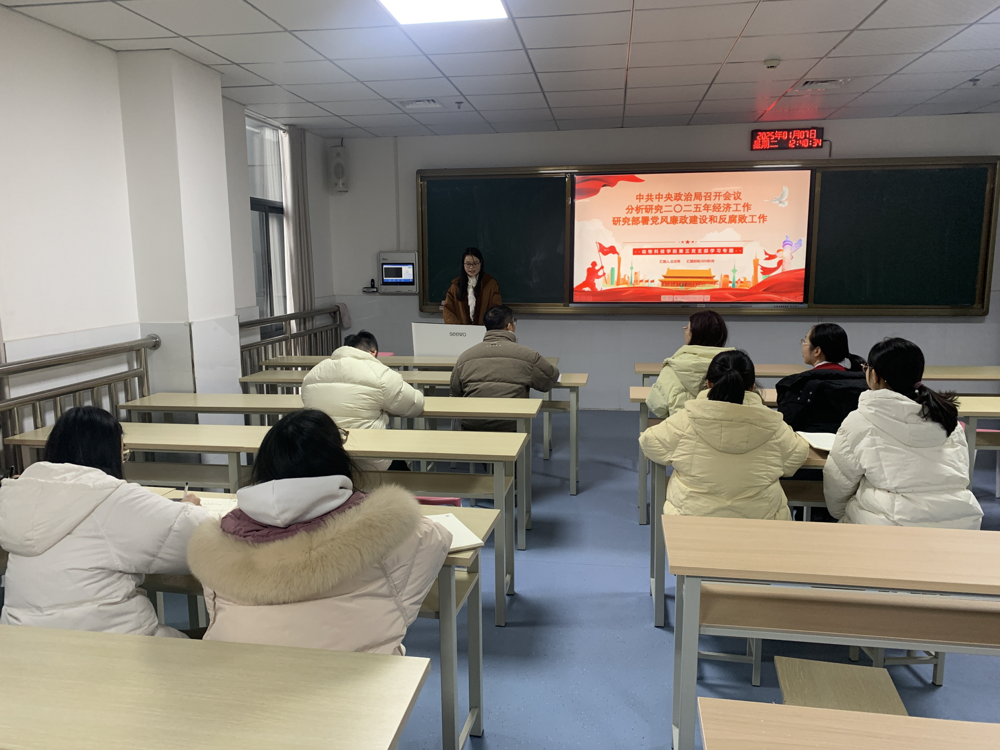王文琴同志组织带领大家学习了“中共中央政治局召开会议分析研究二〇二五年经济工作研究部署党风廉政建设和反腐败工作”。今年是实现“十四五”规划目标任务的关键一年,以习近平同志为核心的党中央团结带领全党全国各族人民,沉着应变、综合施策,经济运行总体平稳、稳中有进,我国经济实力、科技实力、综合国力持续增强。新质生产力稳步发展,改革开放持续深化,重点领域风险化解有序有效,民生保障扎实有力,全年经济社会发展主要目标任务将顺利完成。