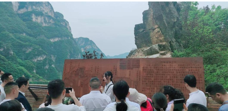 抵达下庄村后,党员们迅速投身现场教学环节。他们换乘商务车前往天路五景,沿着蜿蜒崎岖的 “下庄天路” 徒步前行。陡峭的山势、狭窄的道路,让党员们真切体会到当年村民凿路的艰难。在讲解员的生动讲述中,大家仿若穿越回那段艰苦岁月,深刻理解了下庄人艰苦奋斗、自强不息的拼搏精神。随后,党员们走进“愚公讲堂”,通过观看修路实物展与影像资料,进一步感受到下庄人挑战自然、改变命运的坚定决心,接受了一次深刻的精神洗礼。