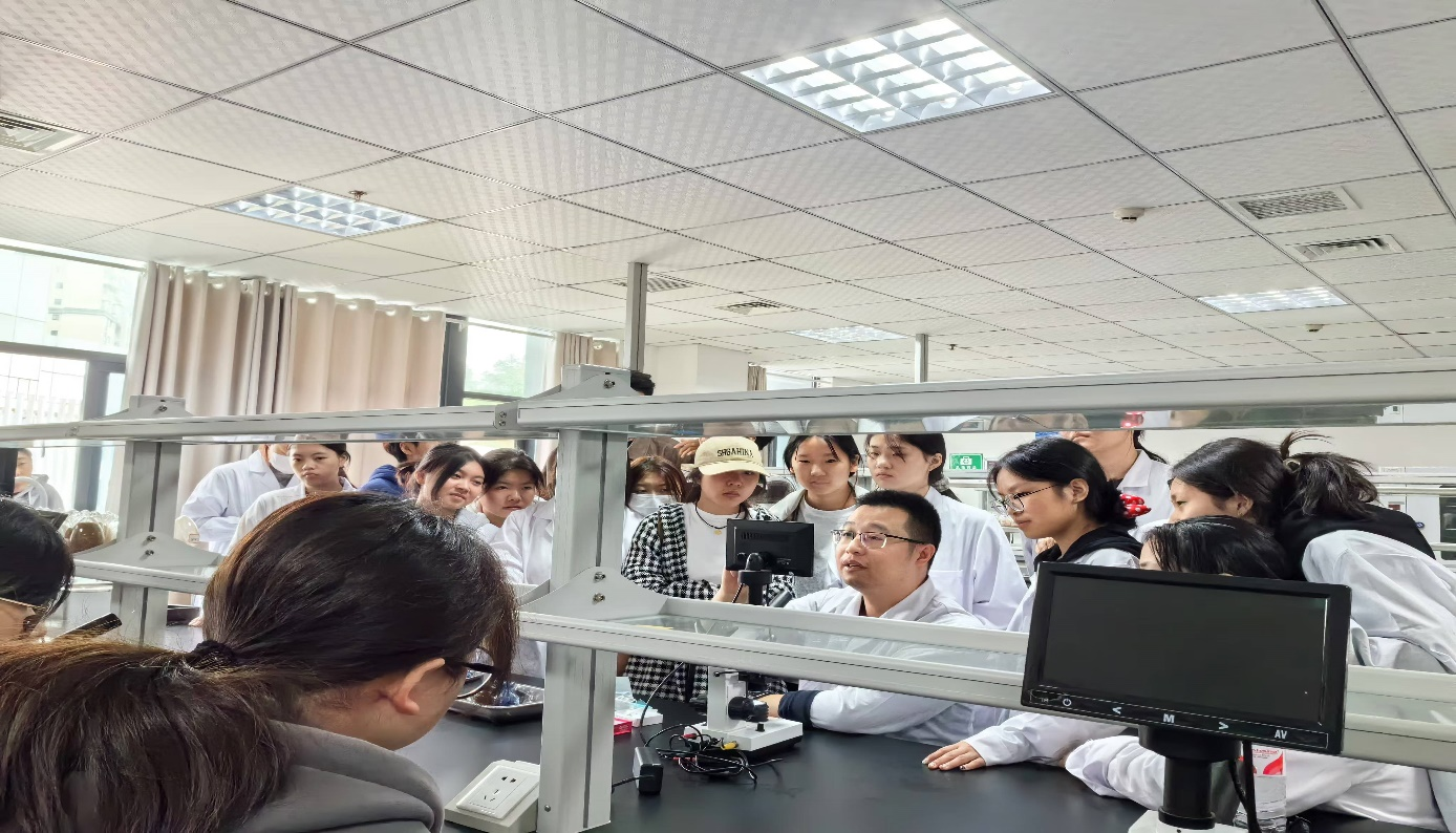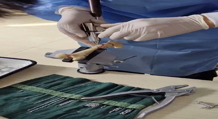 随后,学生们跟随老师前往动物科技学院大楼,学习精液品质检测,用显微镜观看精子活力,精子的运动路线,精子的密度等。同时,学生们还参观了骨科的展示及学习手术的缝合技术,进行骨骼固定的项目,用到的是偏离导转、电钻、骨板、钢丝等具体操作:固定股骨头,打刻尺针固定大转子,然后缠八字钢丝,再缠凤眼钢丝固定股骨头斜骨折,选择合适的骨板和螺钉完成操作。