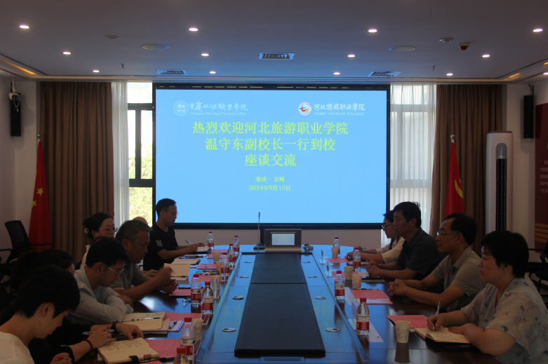 温守东对我院的热情接待表示感谢,对我院服务三峡库区建设发展所作出的贡献表示赞赏,同时介绍了河北旅游职业学院的历史沿革、办学定位和面临的发展问题进行广泛交流,希望通过建立信息桥梁,打通交流瓶颈,实现校校资源共享,同时加大产学融合力度,为两校双向赋能和发展提供助力。