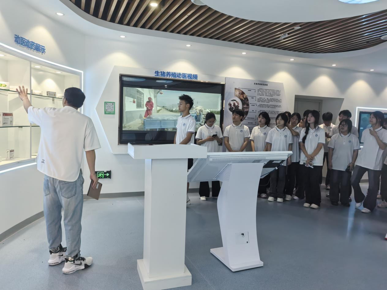 随后,师生前往生猪科技馆进行科普学习。馆内陈列着经典品种猪的标本、动物药品、生猪屠宰饲养系统以及生猪产业链等,便于同学们清晰地观察到猪体的具体构造,了解动物部分相关用药机理和生猪的基本知识。