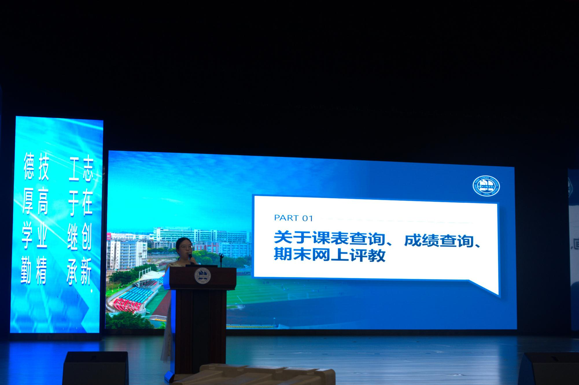 教务处陈芯莹老师为新生讲述教学管理方式,为后续开展教学任务做铺垫,维护教学秩序。