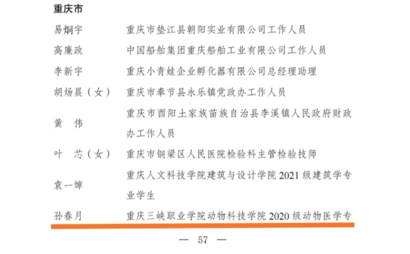 2023年4月7日,共青团中央官微发布信息,对全国五四红旗团委(团支部)、全国优秀共青团员、全国优秀共青团干部拟表彰对象进行公示。动物科技学院2020级动物医学专业孙春月同学荣获“全国优秀共青团员”称号,该评选是共青团中央面向全团开展的先进评选活动,是共青团中央授予共青团员的最高荣誉。