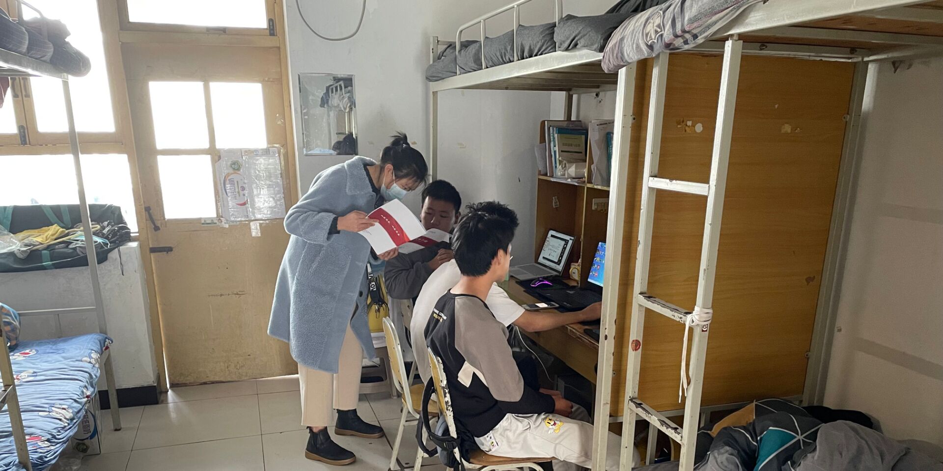 辅导员们对重庆近期疫情防控形势进行了说明,当前重庆疫情正处于上升期,防控工作处于吃紧阶段,告诫同学们要提高防范意识,切实做到两点一线;其次,对近期网课进行了现场督查,要求同学们不能放松学习,做好本职工作,与任课老师形成良好互动局面,共同把好线上教学关,营造良好的学习氛围。