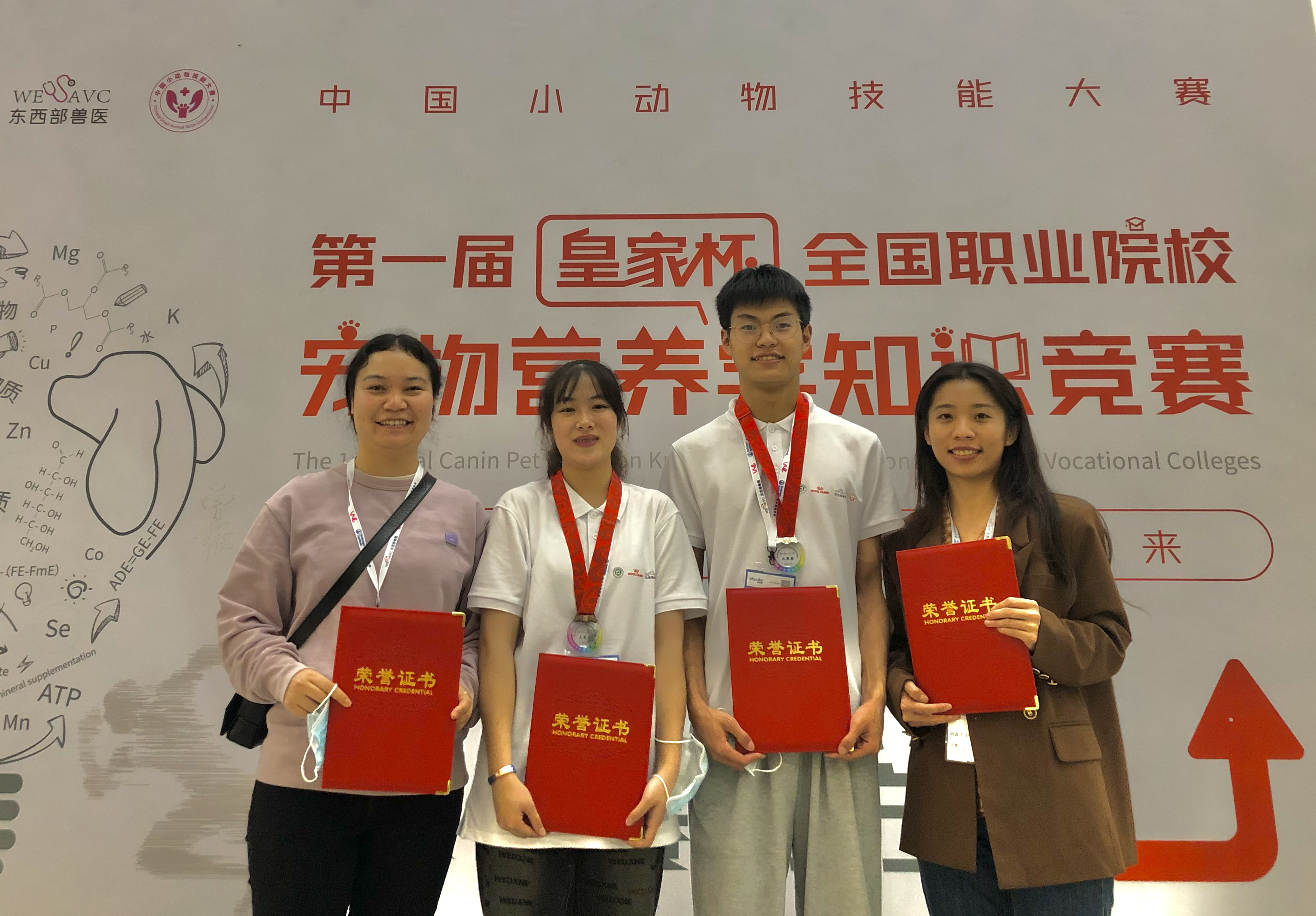 11月2-4日,由皇家宠物食品主办,东西部兽医和中国现代畜牧业职教集团鼎力支持的首届“皇家杯”全国职业院校宠物营养学知识竞赛在第十四届东西部小动物兽医师大会上举行。由我院王晓艳、吕倩老师指导的宠物临床诊疗技术专业的罗万权、夏远娇同学分别荣获二等奖、三等奖。王晓艳、吕倩老师均荣获优秀指导老师奖。
