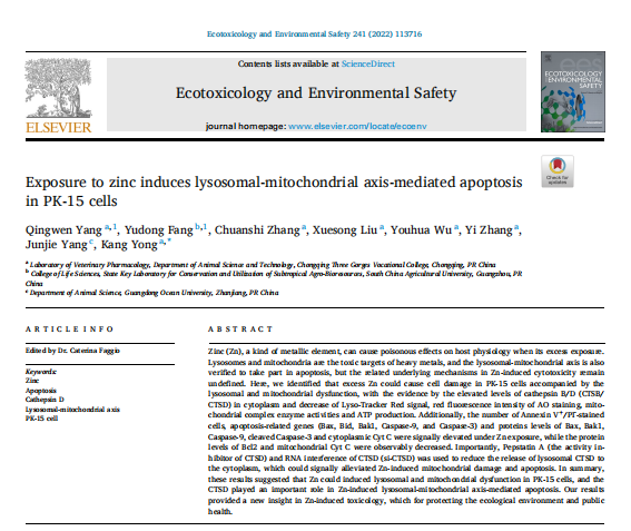 近日,我院杨庆稳博士带领研究团队在SCI2区TOP期刊中发表一篇影响因子为6.291的高水平文章,文章名称为Exposure to zinc induces lysosomal-mitochondrial axis-mediated apoptosis in PK-15 cells,期刊名称为《Ecotoxicology and Environmental Safety》。该文章是重庆市科技局以及学校提供资金支持重点建设的自然科学基金项目成果,主要研究溶酶体-线粒体轴介导细胞凋亡在高锌诱导猪肾损伤中的作用机制。