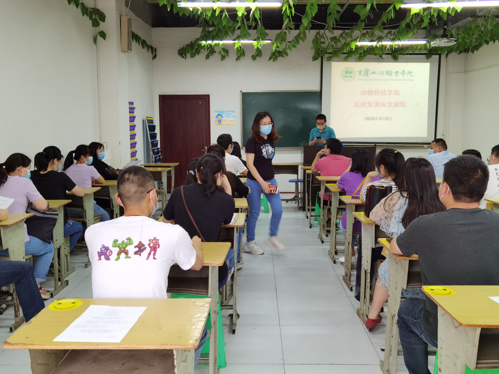 演练过程从学生进入动科实训中心畜禽生产实训室101开始,对学生进入教室时的排队入场、洗手消毒、咳嗽、发热应急处置办法等进行了全方位模拟演练。每个环节都严格按照学校《新冠肺炎疫情应急处置演练方案》工作流程进行,力求在演练中培训、在演练中规范,为迎接学生顺利返校做充分准备。