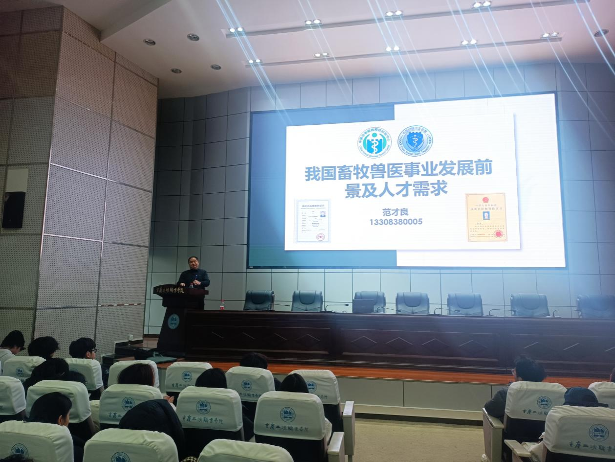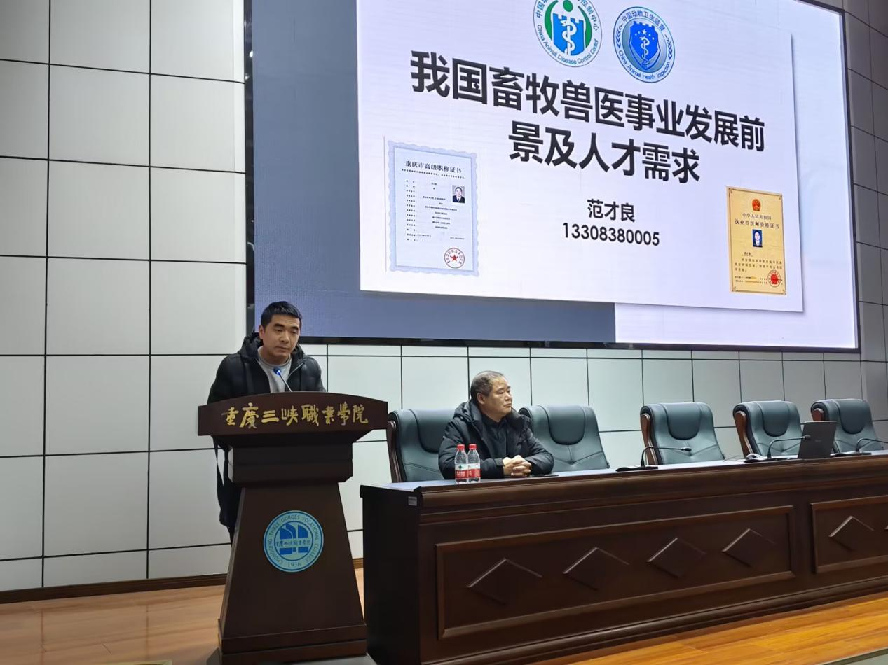 1月5日上午,重庆三峡职业学院动物科技学院邀请重庆市荣昌区动物疫控中心范才良教授到校开展《我国畜牧业发展前景及人才需求》专题讲座。我院2024级畜牧兽医专业400余名学生参加,讲座由动物科技学院李鹏超老师主持。