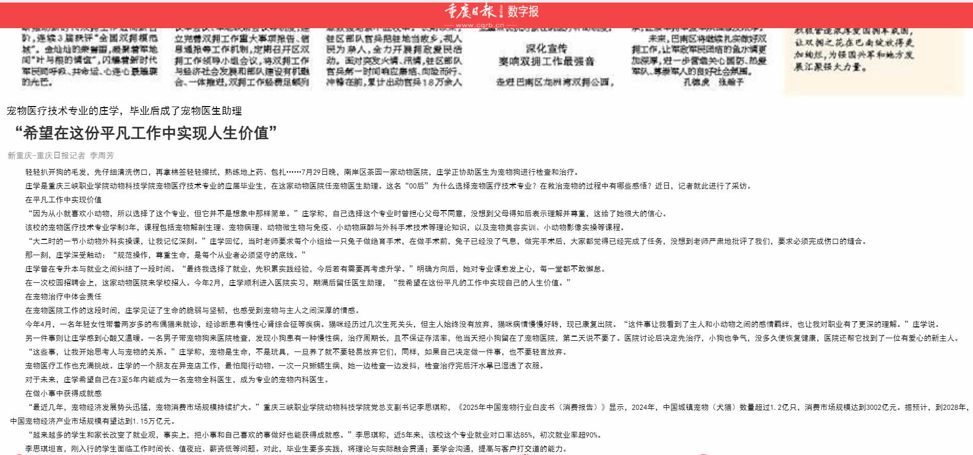 在一次校园招聘会上,动物医院来学校招人。“招聘老师现场问我为什么想从事这个职业,我说我从小喜爱小动物,也希望在这份平凡的工作中实现自己的人生价值。”今年2月,她顺利进入医院实习,期满后留任医生助理。