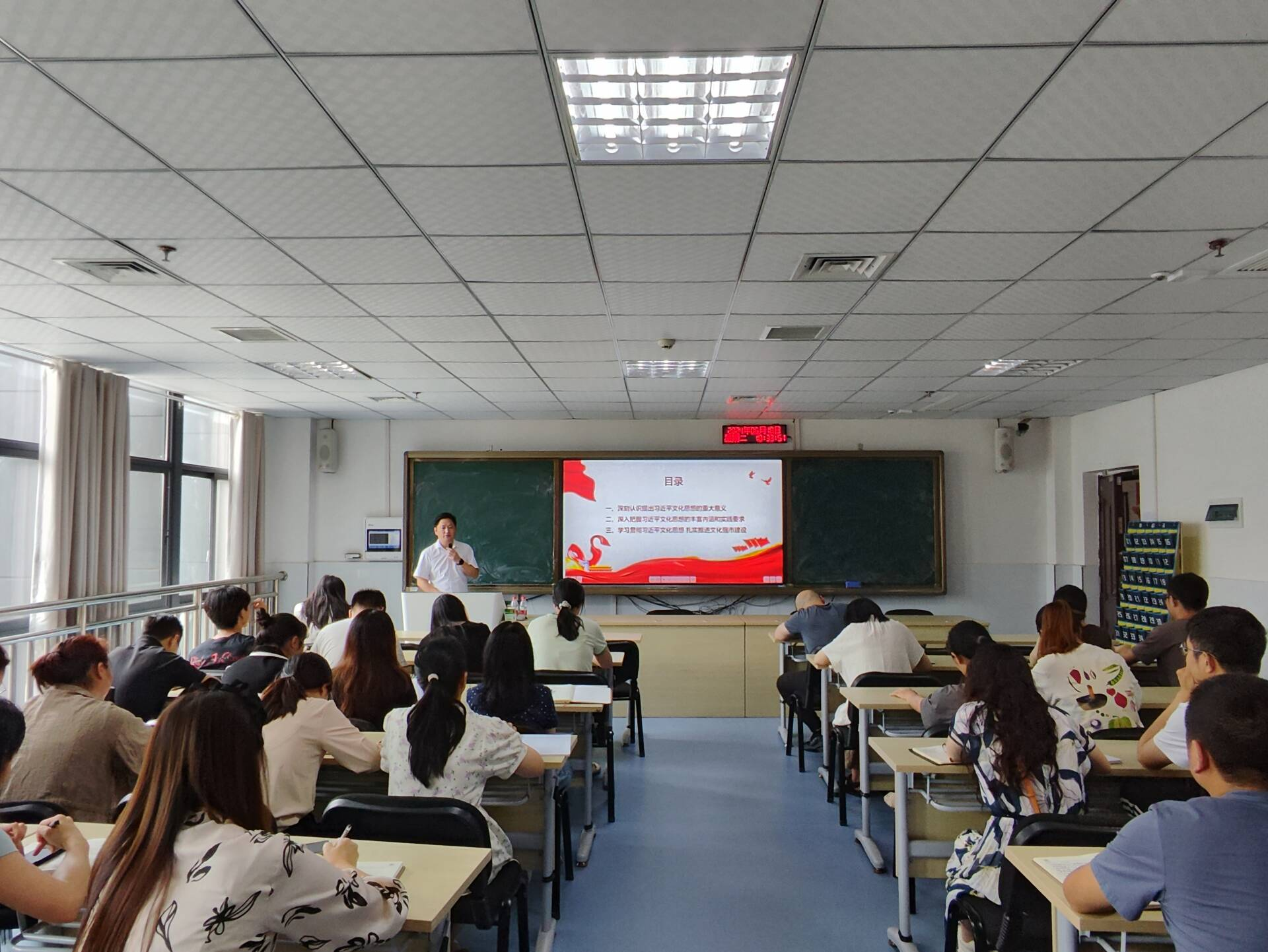 为深入学习贯彻习近平文化思想,加快打造新时代文化强市,2024年6月18日上午,学院党委委员、副院长张传师在现代畜牧科技大楼为动物科技学院全体教职工宣讲习近平文化思想。