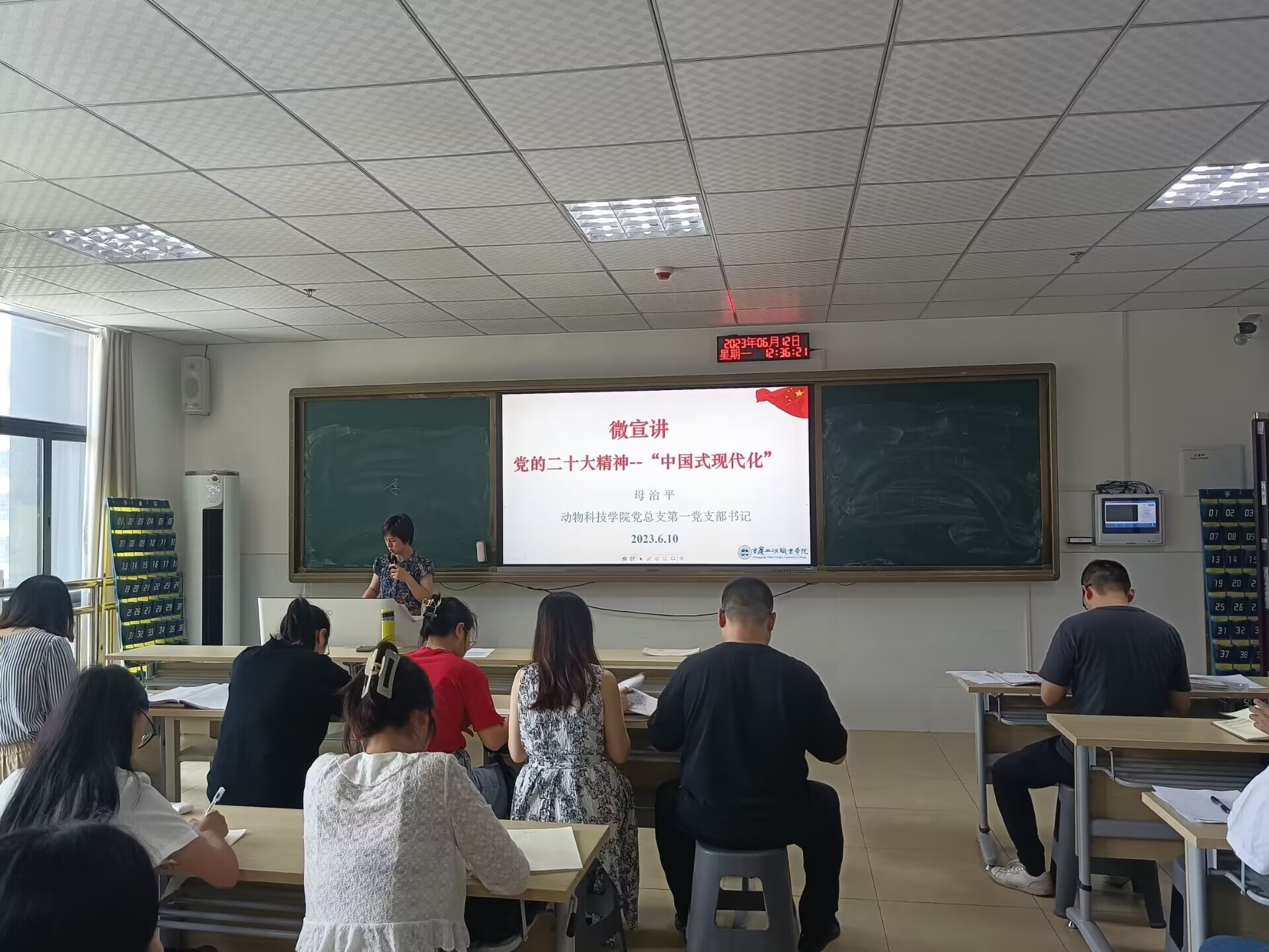 2023年6月12日中午12:40,动物科技学院党总支第一党支部在现代畜牧大楼614教室开展了支部书记讲党课活动,本次专题党课题目为:党的二十大精神——“中国式现代化”。该党课由动科一支部书记母治平同志主持,一支部党员、预备党员、入党积极分子参与此次学习。