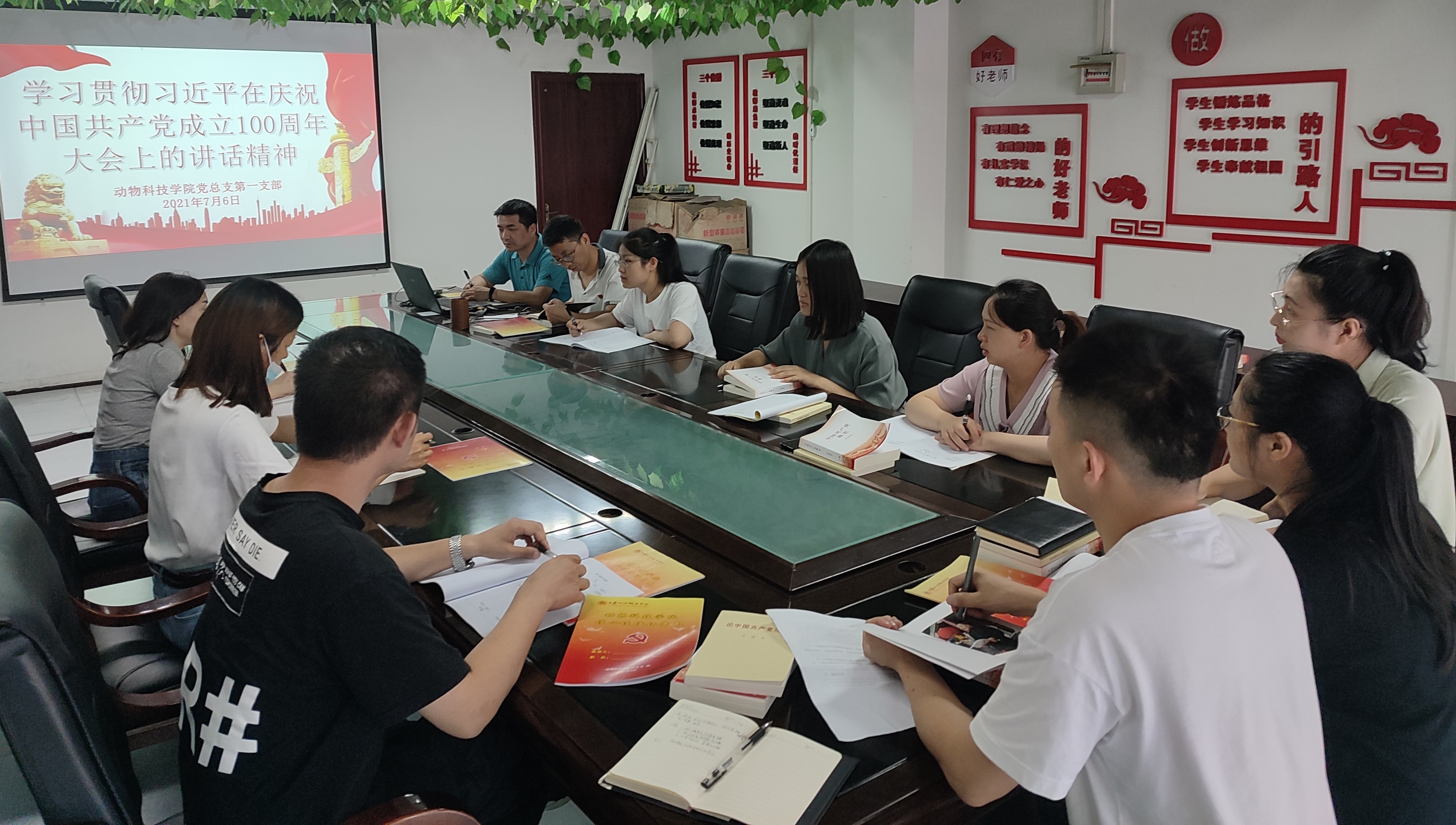 2021年7月6日下午2:00动物科技学院一支部在动科120组织12名党员同志开展三会一课学习研讨活动,支部书记陈脊宇同志首先介绍了本次学习研讨的内容,学习贯彻习近平在庆祝中国共产党成立100周年大会上的讲话精神。专职组织员谭丽同志对各同志的学习情况进行检查,对学习心得进行分享,从讲话精神中汲取精神力量,从而激发全体党员干事干业热情。