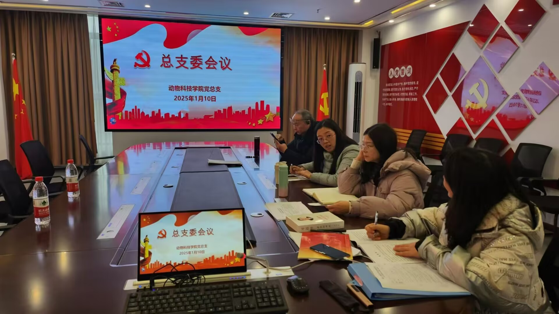 2025年1月10日上午,动物科技学院党总支在动科306会议室开展1月“三会一课”和主题党日活动。会议由学校党委委员、动科党总支书记熊辉俊主持,党总支副书记李思琪及总支委员参会。