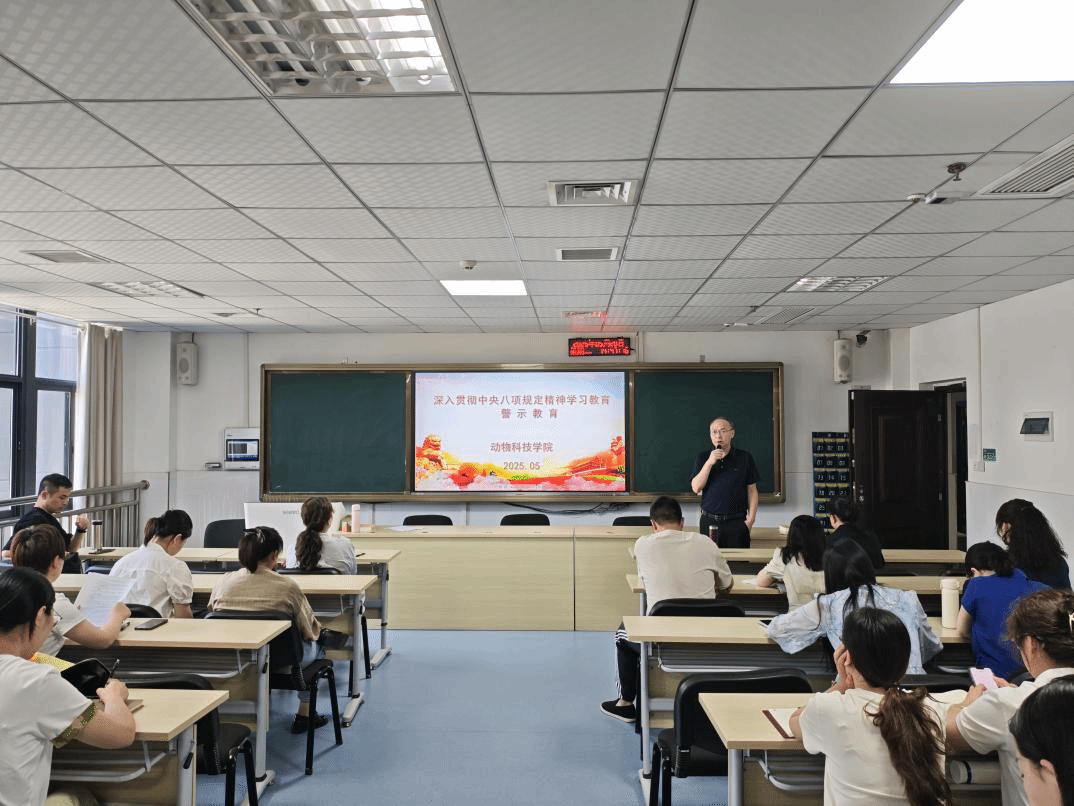 2025年5月20日,动物科技学院在畜牧科技大楼414会议室召开深入贯彻中央八项规定精神学习教育警示教育大会。会议由动物科技学院党总支纪检委员张崇英主讲,学院全体教职工参会。