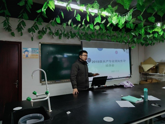 2021年1月3日,水产养殖技术专业全体教师与2018级水产班学生在动科楼121教室召开了顶岗实习的动员会。教研室主任任思宇老师重点将实习内容,实习时间及实习过程中会遇到的问题向学生们进行了梳理与阐述。会上,他向学生说明了实习过程一定会按照重庆市教委与重庆三峡职业学院针对教学的管理规定实施过程评价与考核。