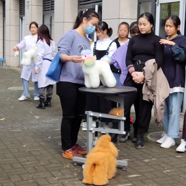 李龙娇、王晓艳老师和学姐带领大家进校宠物美容体验