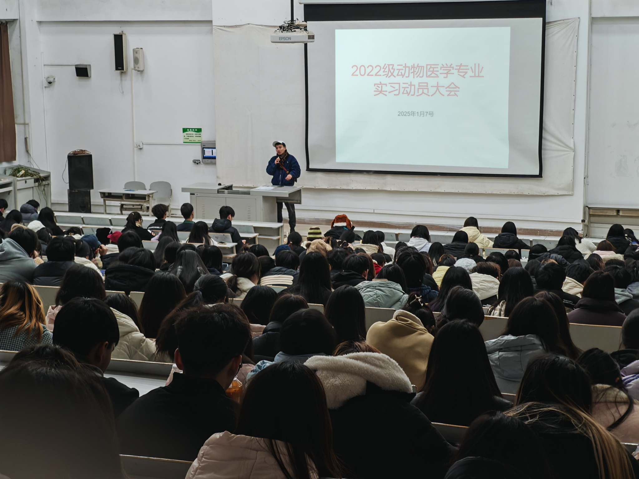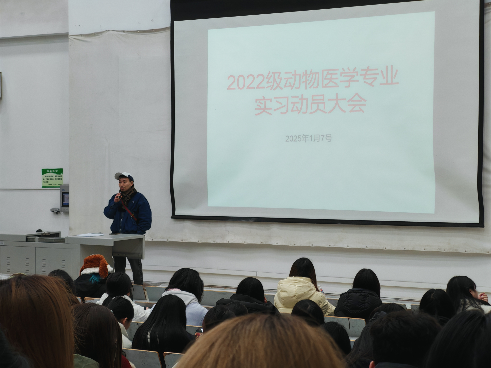 2022级动物医学专业实习动员大会于2025年1月7日在博雅楼阶梯教室召开,实习大会由动物医学专业主任吕永智老师主讲,2022级动物医学专业全体学生参会。
