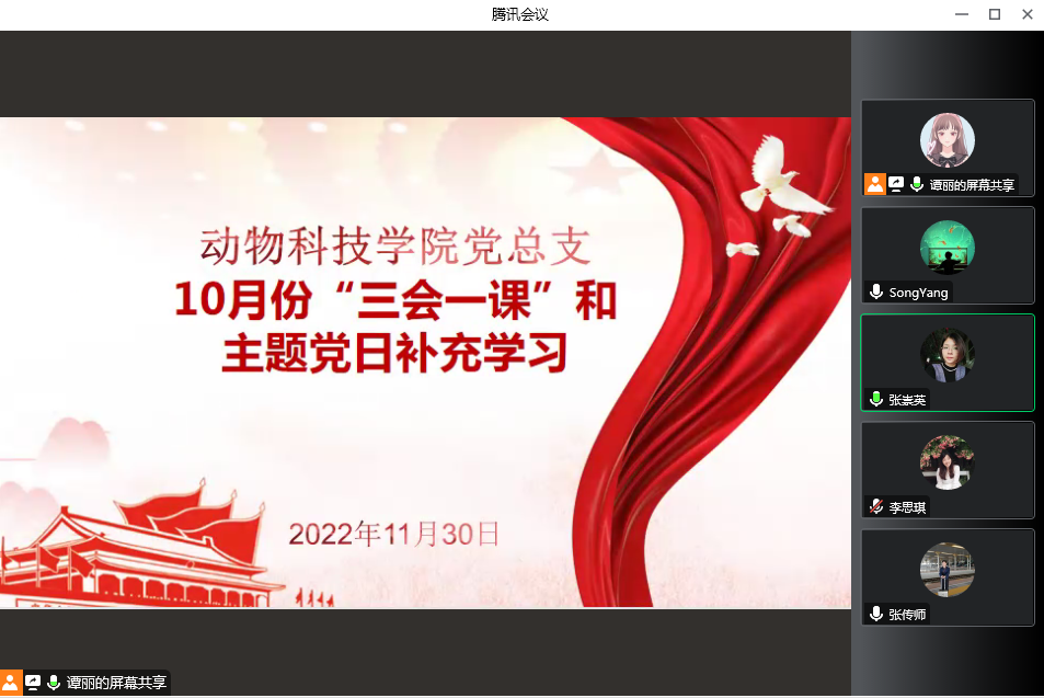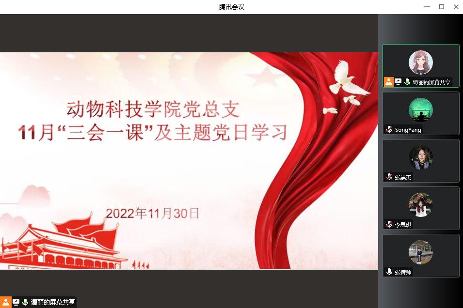 2022年11月30日下午,动物科技学院党总支在线上开展11月“三会一课”学习,并对十月份的主题党日活动进行补充学习。会议由动物科技学院党总支书记、院长张传师主持,党总支副书记李思琪以及党总支全体委员参加学习。