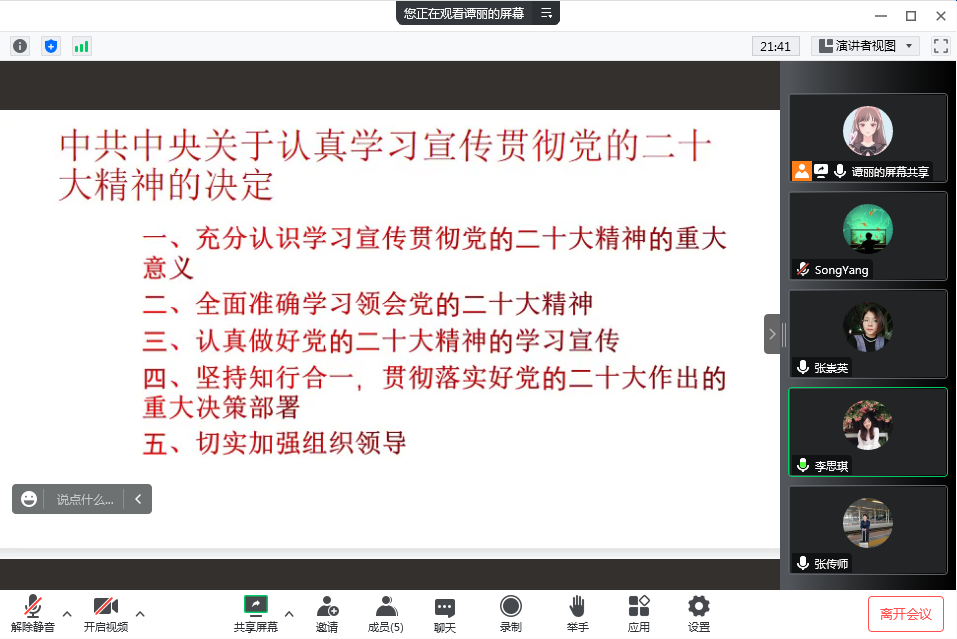 会议由各总支委成员集中线上传达学习:中国共产党第二十届中央委员会第一次全体会议公报;习近平总书记在中共中央政治局第一次集体学习时重要讲话精神;习近平总书记在瞻仰延安革命纪念地时重要讲话精神;中共中央关于认真学习宣传贯彻党的二十大精神的决定。