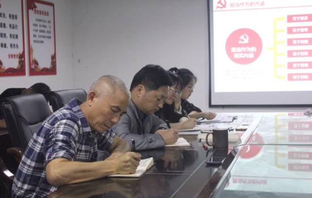会议分四个阶段,首先由母治平和叶琴同志带领大家集中学习原文原著人民日报的《担使命,勇于担当,积极作为--牢牢把握主题教育总要求》。明白担当作为的时代内涵、新时代赋予党员同志们的新担当和新使命以及党员同志如何坚守五心,勇担当,敢作为。