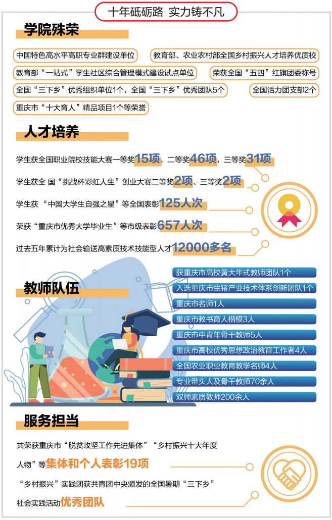 凭借突出的贡献,学院2021年入选全国乡村振兴人才培养优质校,“‘田间学院’助推乡村振兴——涉农高职院校‘三农’人才培养模式创新与实践”获2021年重庆市教学成果奖特等奖。