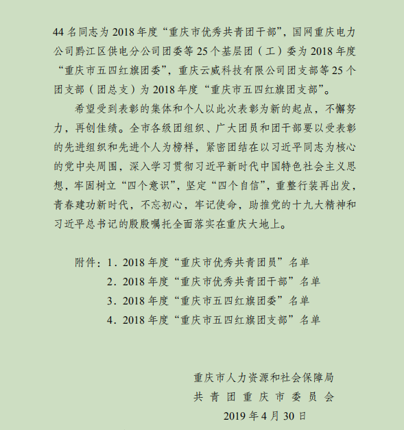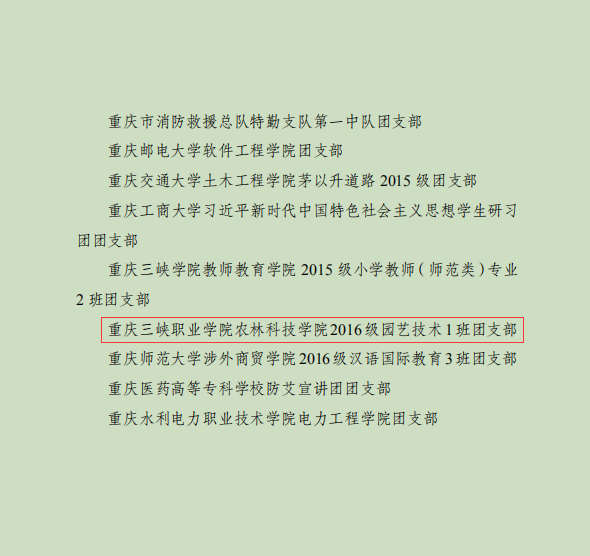 近日,据重庆市人力资源和社会保障局、共青团重庆市委员会《关于表彰2018年度“重庆市优秀共青团员”“重庆市优秀共青团干部”“重庆市五四红旗团委(团支部)”的决定》,我校农林科技学院2016级园艺技术1班团支部荣获2018年度“重庆市五四红旗团支部”殊荣。