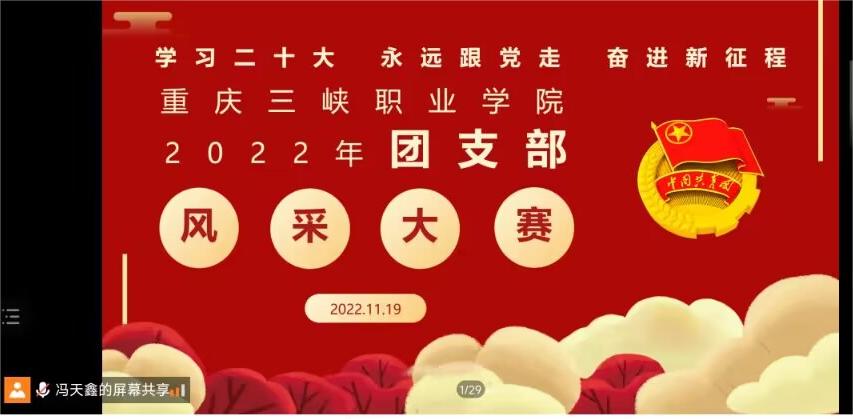 为学习贯彻党的二十大精神,进一步加强基层团组织的凝聚力和向心力,展现基层团组织风采,11月19日,校团委举办了第二届团支部风采大赛。会议采用腾讯会议进行直播,全体团支部书记在云端进行观摩。党政办主任、团委书记马绍文,学工部副部长陶毅,教务处副处长幸荔芸,学工部副部长、团委副书记彭钦担任比赛评委。