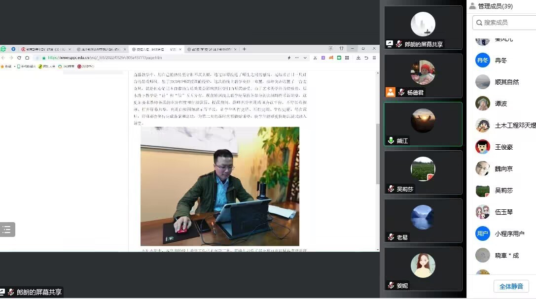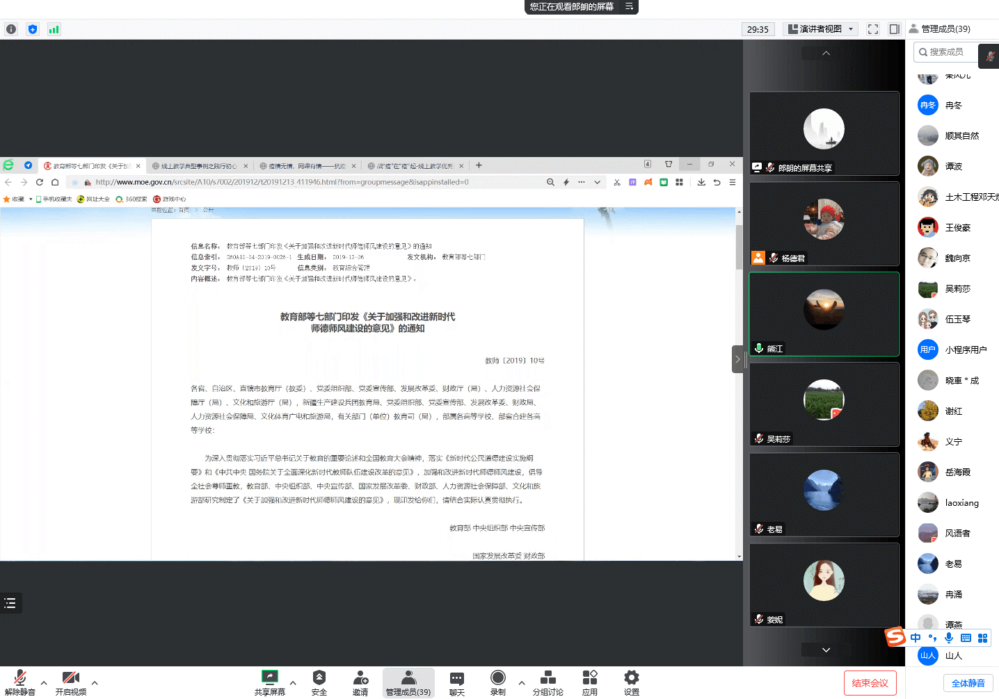 会上,副院长郎朗首先围绕教育部印发的《关于加强和改进新时代师德师风建设的意见》展开了学习,同时以抗疫线上教学三位教师的优秀事迹为例,要求老师们加强学习,提质线上教学,促进五育并举。