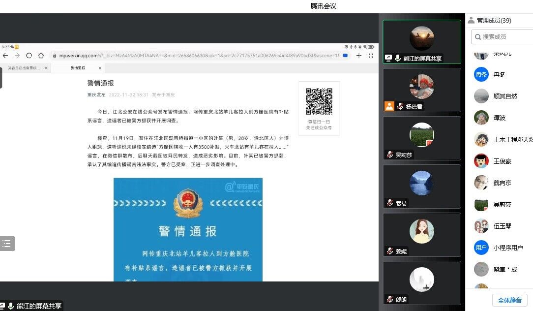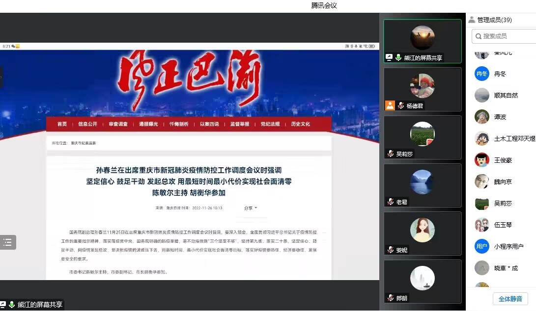 随后,副书记黄滔组织大家开展警示教育。集中学习了国务院副总理孙春兰在11月25日出席重庆市新冠肺炎疫情防疫工作调度会议上的讲话精神,并对近期疫情防控相关的网络舆情进行了通报。他号召全体教师要遵守疫情防控相关规定,不信谣、不传谣;党员同志要亮身份、见行动,冲在抗疫第一线,助力学校疫情防控工作,充分展现特殊时期的使命担当,以实际行动贯彻落实党的二十大精神。