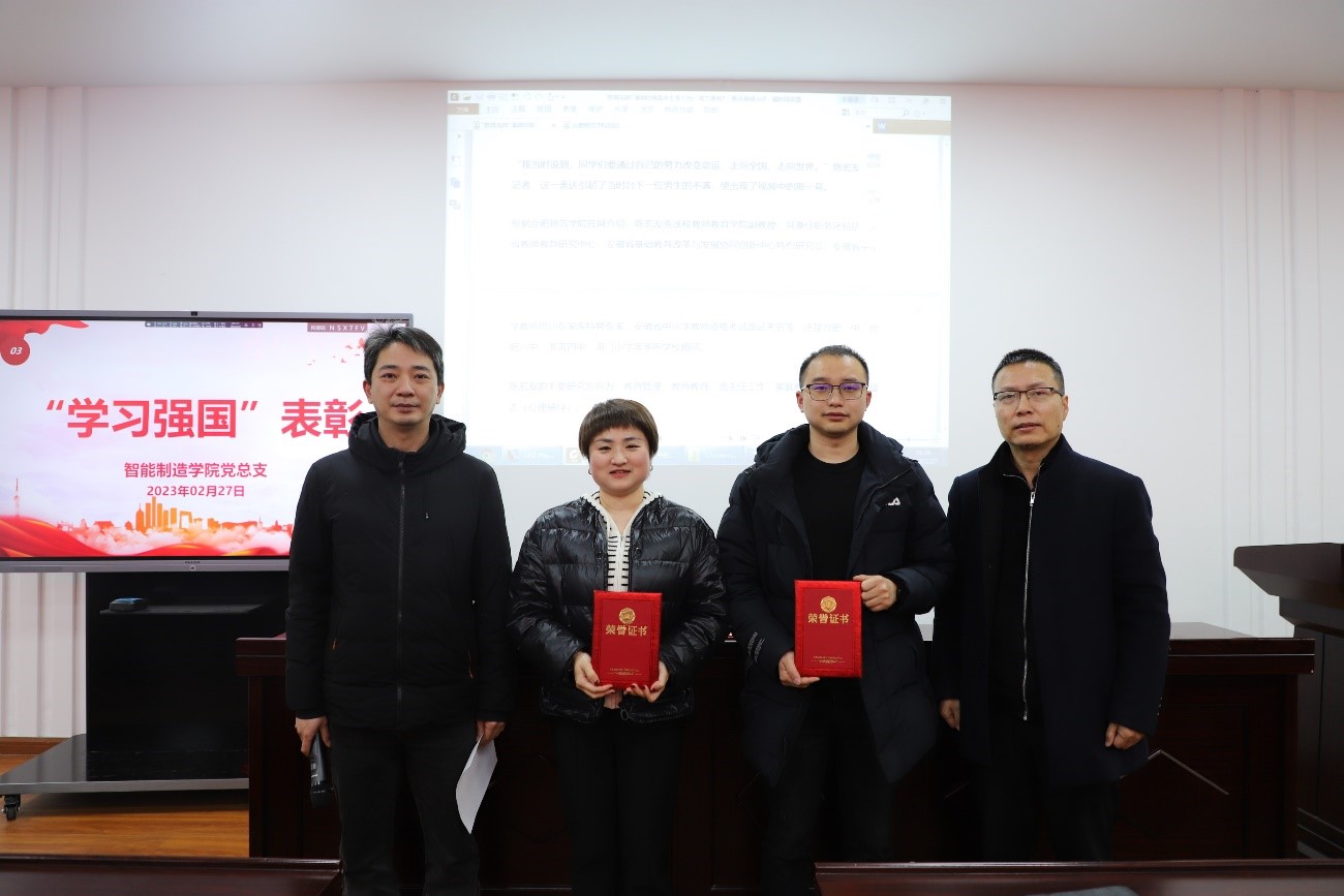为进一步巩固智能制造学院“学习强国”平台的学习成效,激发全院师生持续学习的热情,2月27日下午,智能制造学院党总支在奥训楼308会议室召开了2022年度“学习强国”平台学习竞赛表彰大会,对学习成绩突出的教师予以表彰。