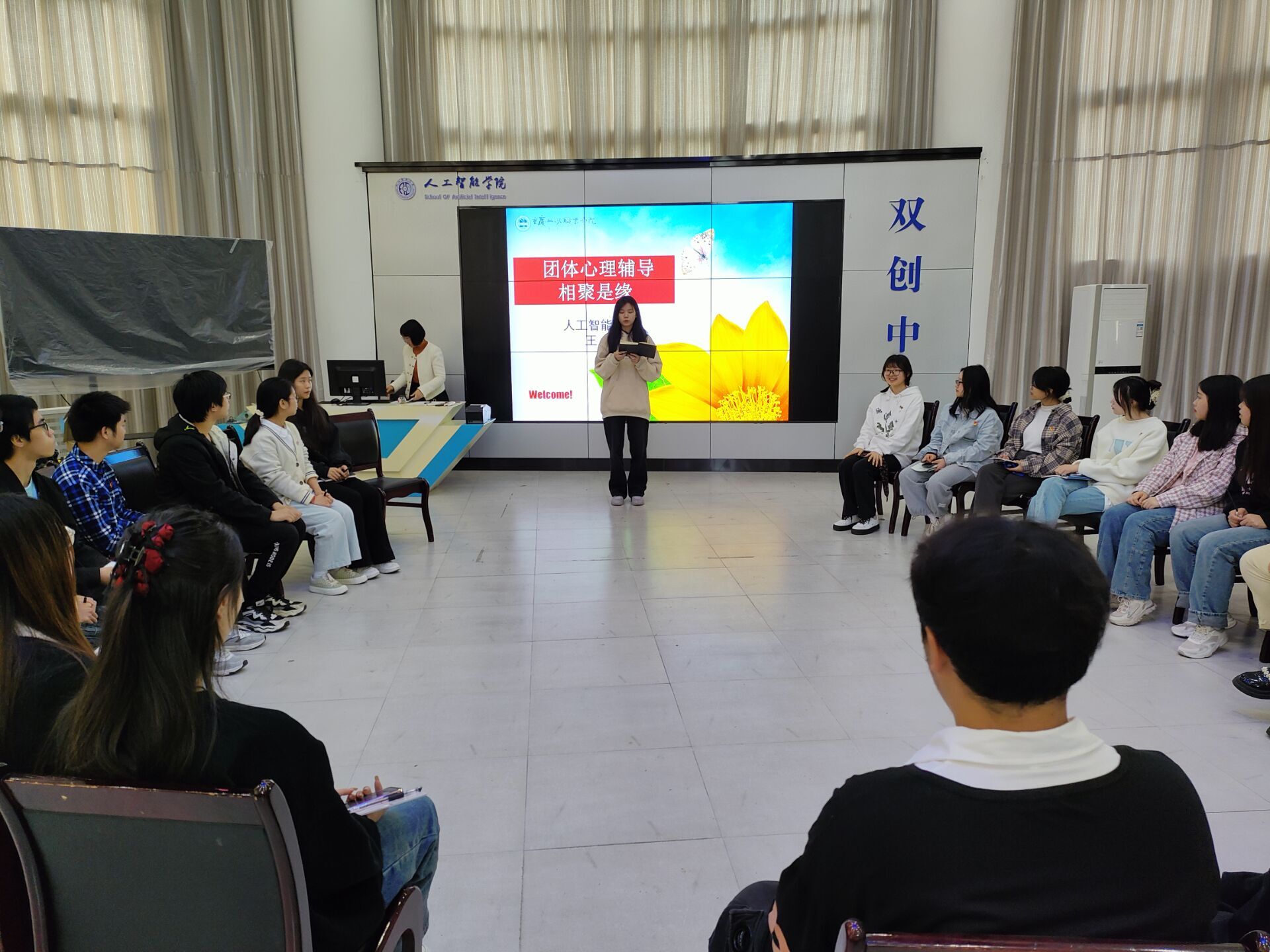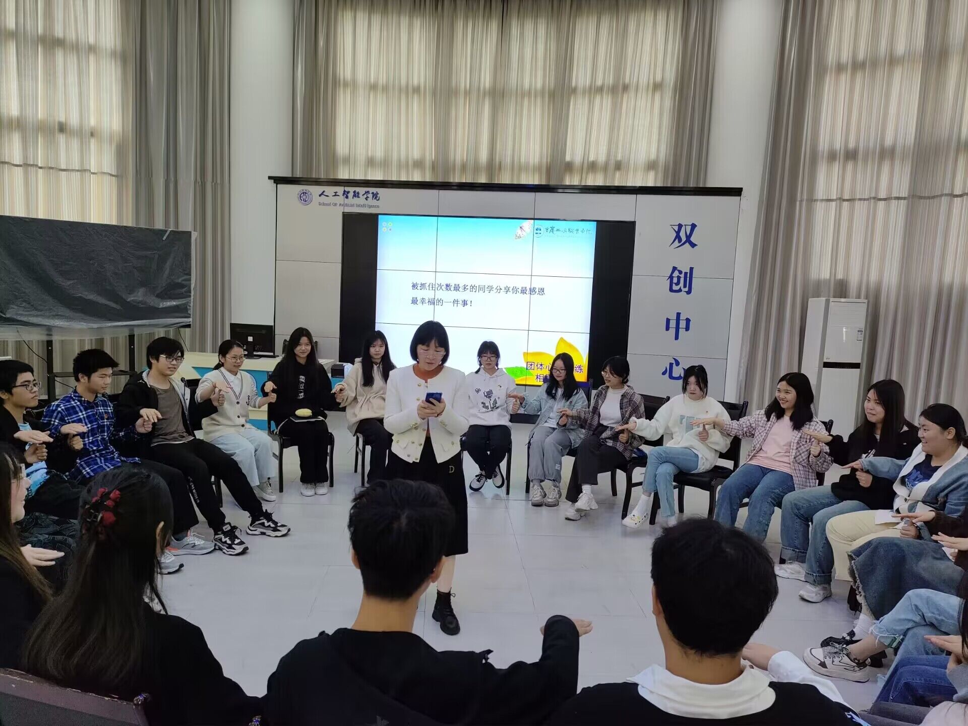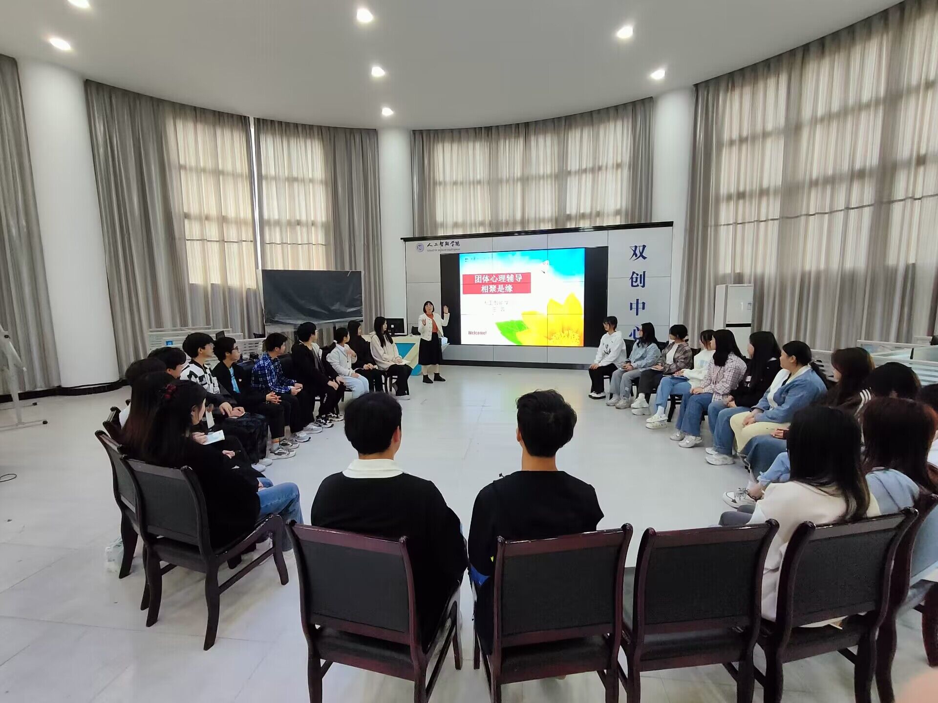 4月25日下午,人工智能学院团总支学生会“第一届学生干部培训班”第一课——团体心理辅导,相聚是缘在信科楼701举行,本次课程由学工科长王蓉老师主讲。