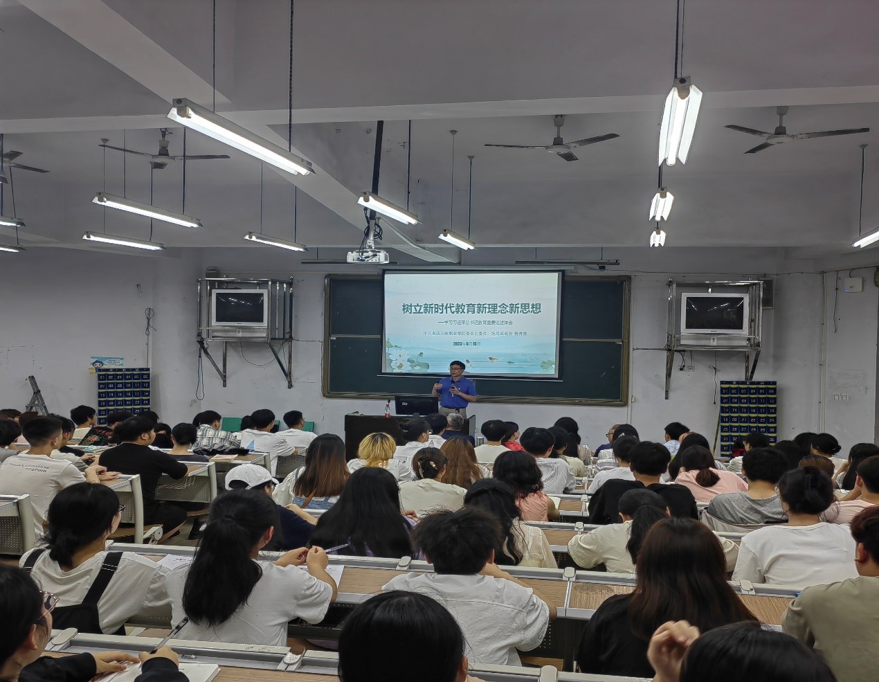 杨吉林部长以“树立新时代教育新理念新思想——学习习近平总书记教育重要论述体会”为题,从教育理念的意义、新时代何以特别需要科学的教育理念、十大理念内涵、个人感悟等四方面进行了详细地讲述。杨吉林部长幽默风趣的语言,赢得了现场师生的阵阵掌声。