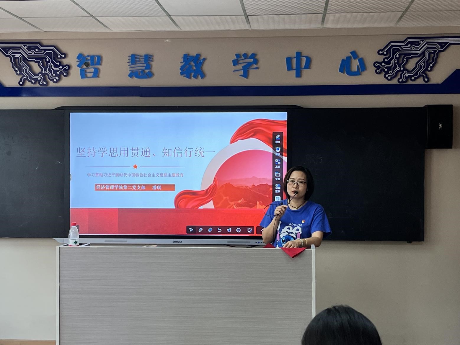 为持续深入开展学习贯彻习近平新时代中国特色社会主义思想主题教育,努力把学习成果转化为推动学院事业发展的强大力量,6月15日中午,经济管理学院党总支第二党支部在沙龙校区综合楼中餐实训室开展主题教育专题党课培训,第二党支部书记潘琪带领全体党员师生和入党积极分子深入学习和探讨。
