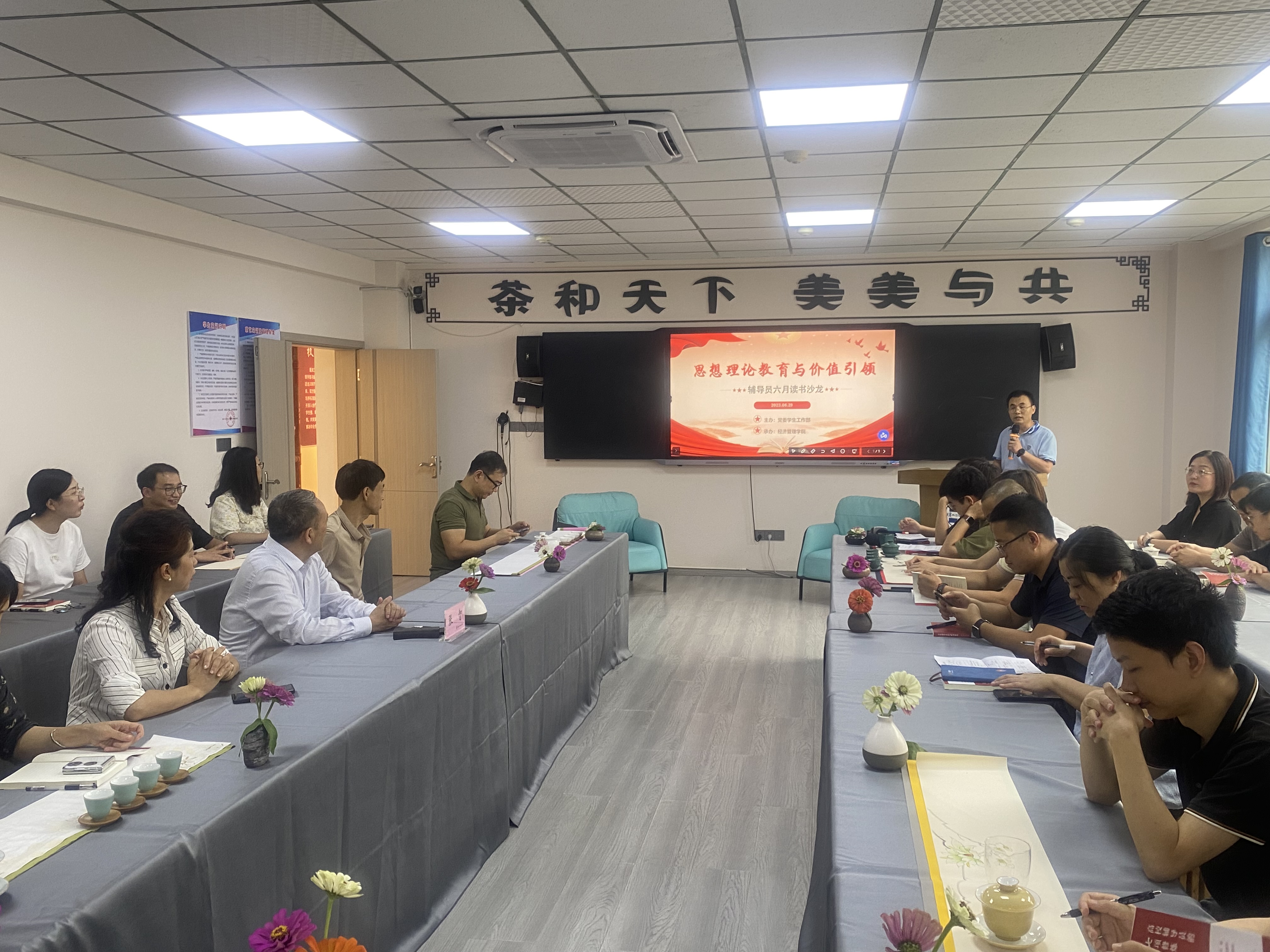 为深入开展习近平新时代中国特色社会主义思想主题教育,进一步提升辅导员的理论水平和专业素养,努力把习近平新时代中国特色社会主义思想转化为立德树人、教书育人的强大力量。6月29日下午,由党委学生工作部主办,经济管理学院承办的“思想理论教育与价值引领”主题六月辅导员读书沙龙在沙龙校区综合楼505茶艺实训室举行。学院党委副书记张智出席活动,党委学生工作部副部长陶毅、卢文凤、彭钦,各二级学院党总支副书记、学工科长、专职辅导员参加了读书沙龙。