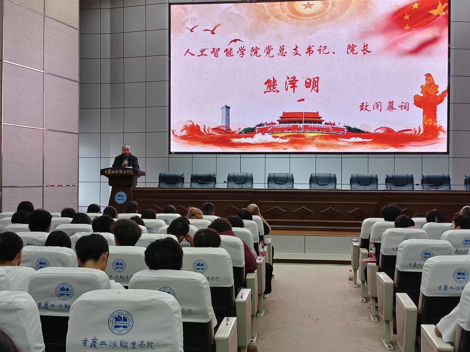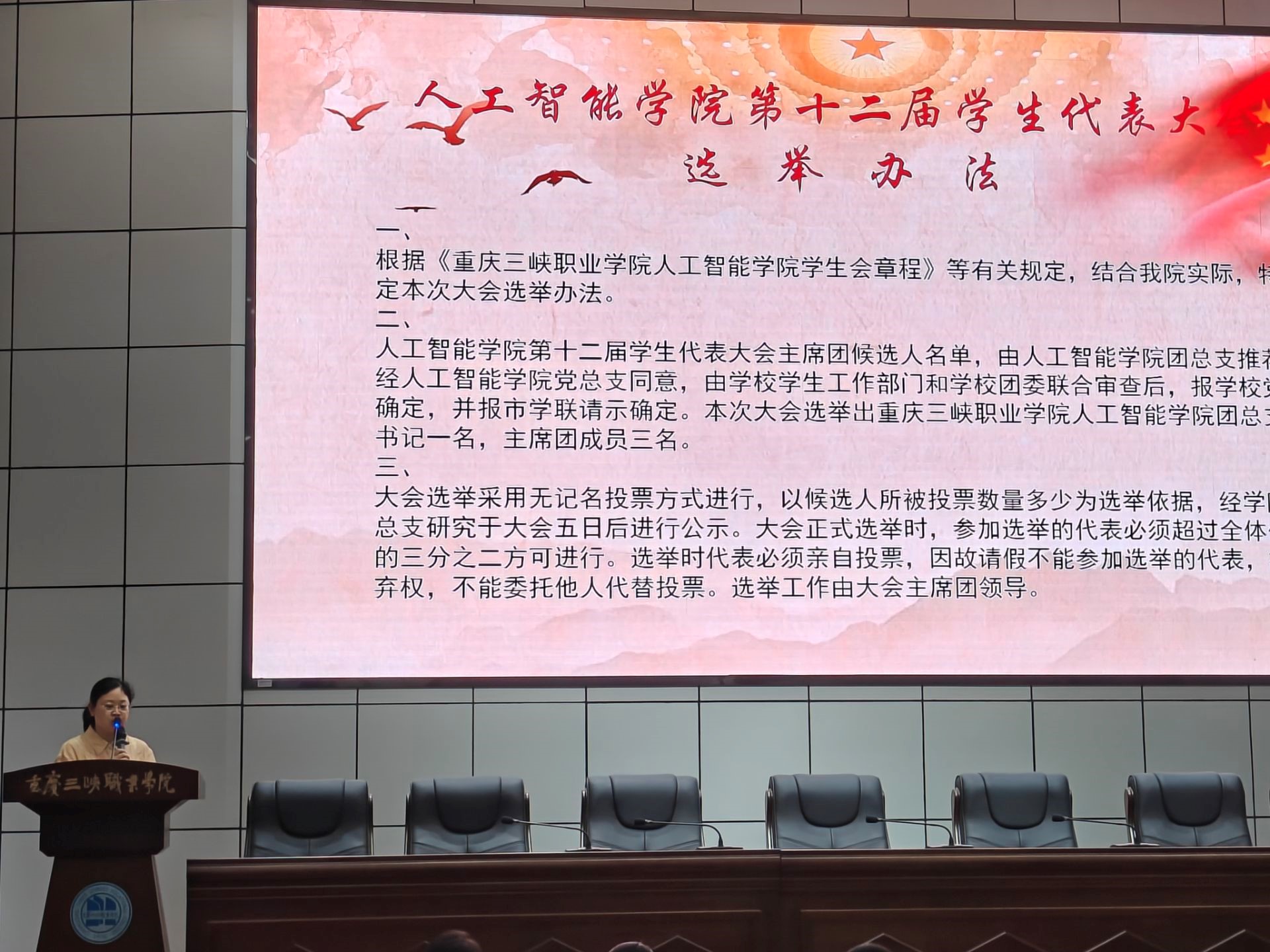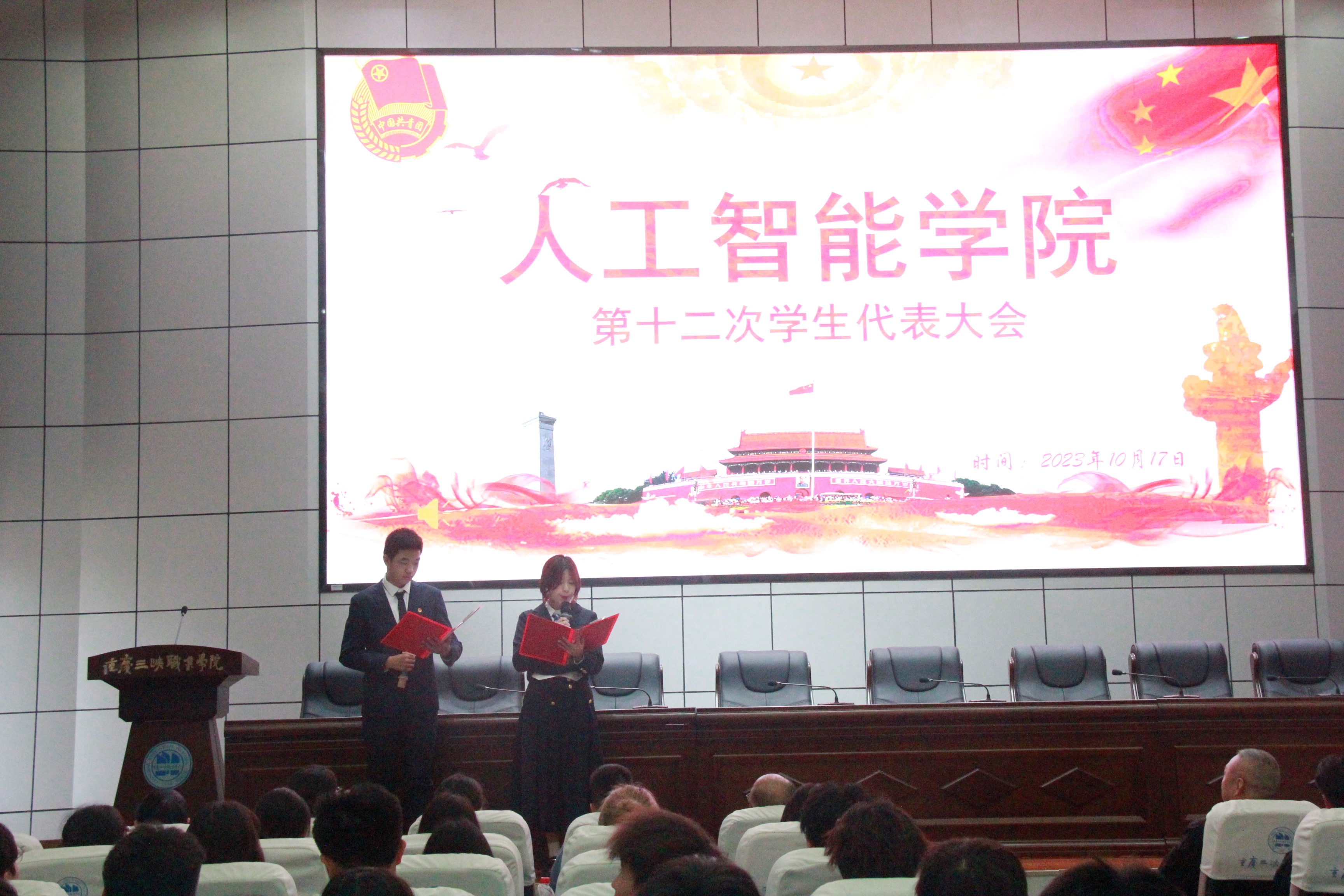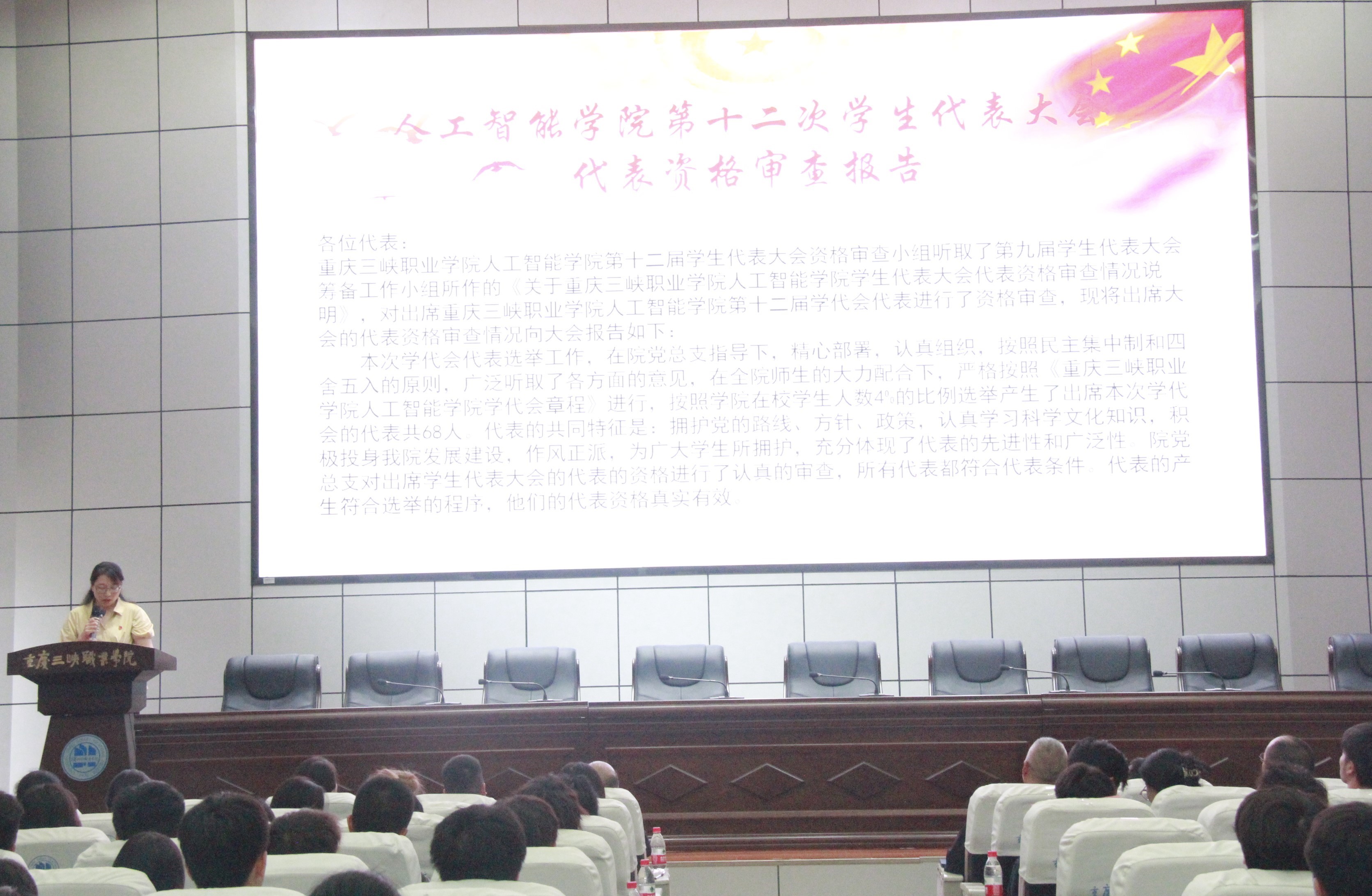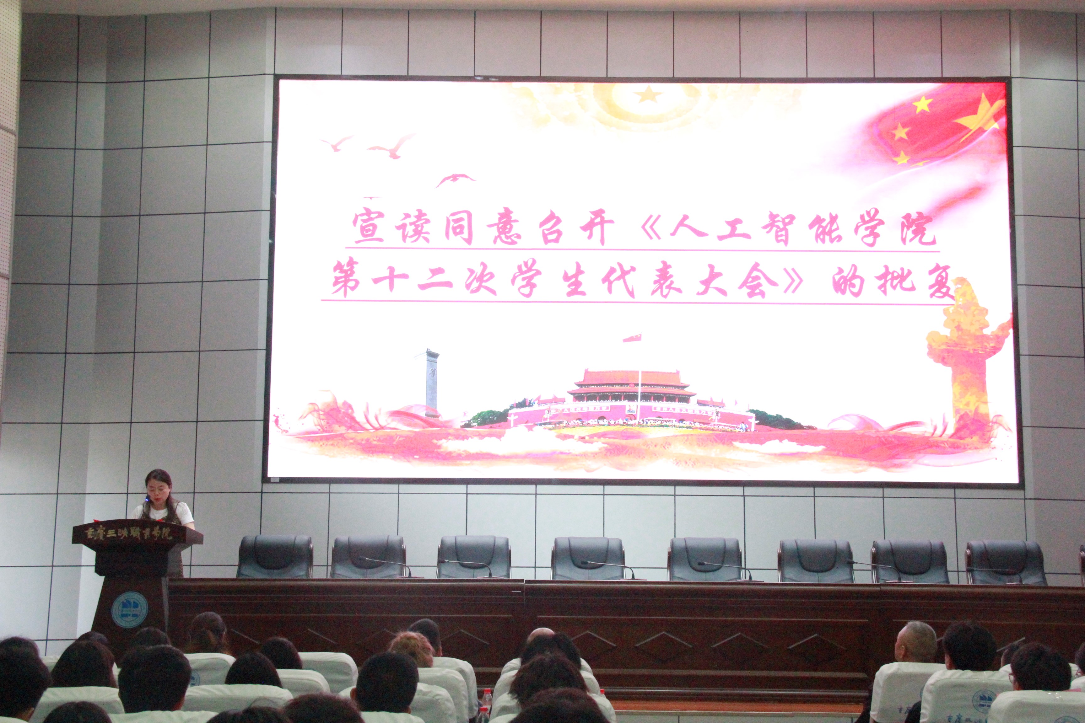大会在嘹亮的国歌声中拉开帷幕。人工智能学院第二党支部书记雷蕾宣读共青团重庆三峡职业学院委员会同意召开人工智能学院第十二次学生代表大会》的批复。