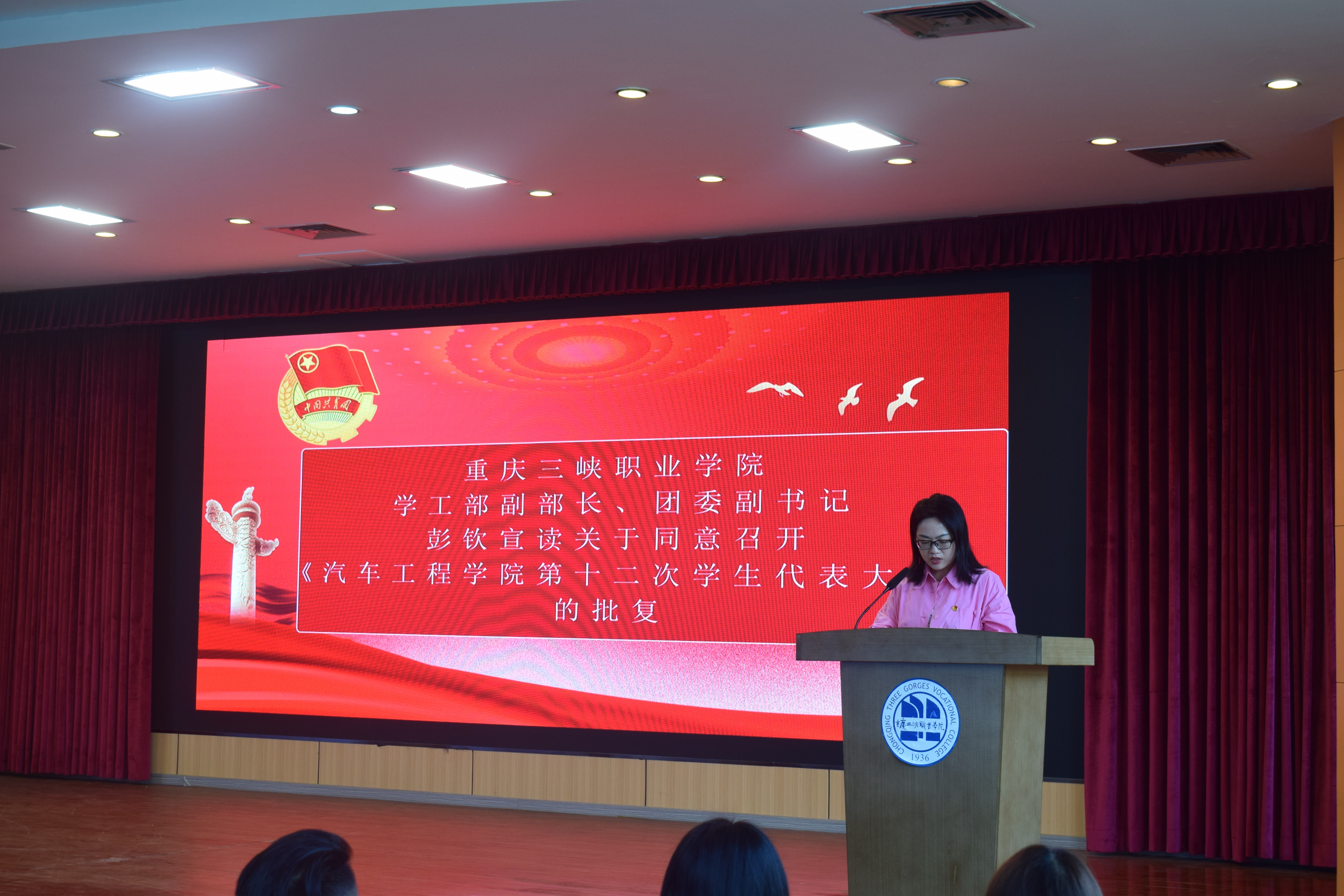 会议在庄严的国歌声中正式开幕。学工部副部长、团委副书记彭钦宣读《关于同意召开汽车工程学院第十二次学生代表大会的批复》。