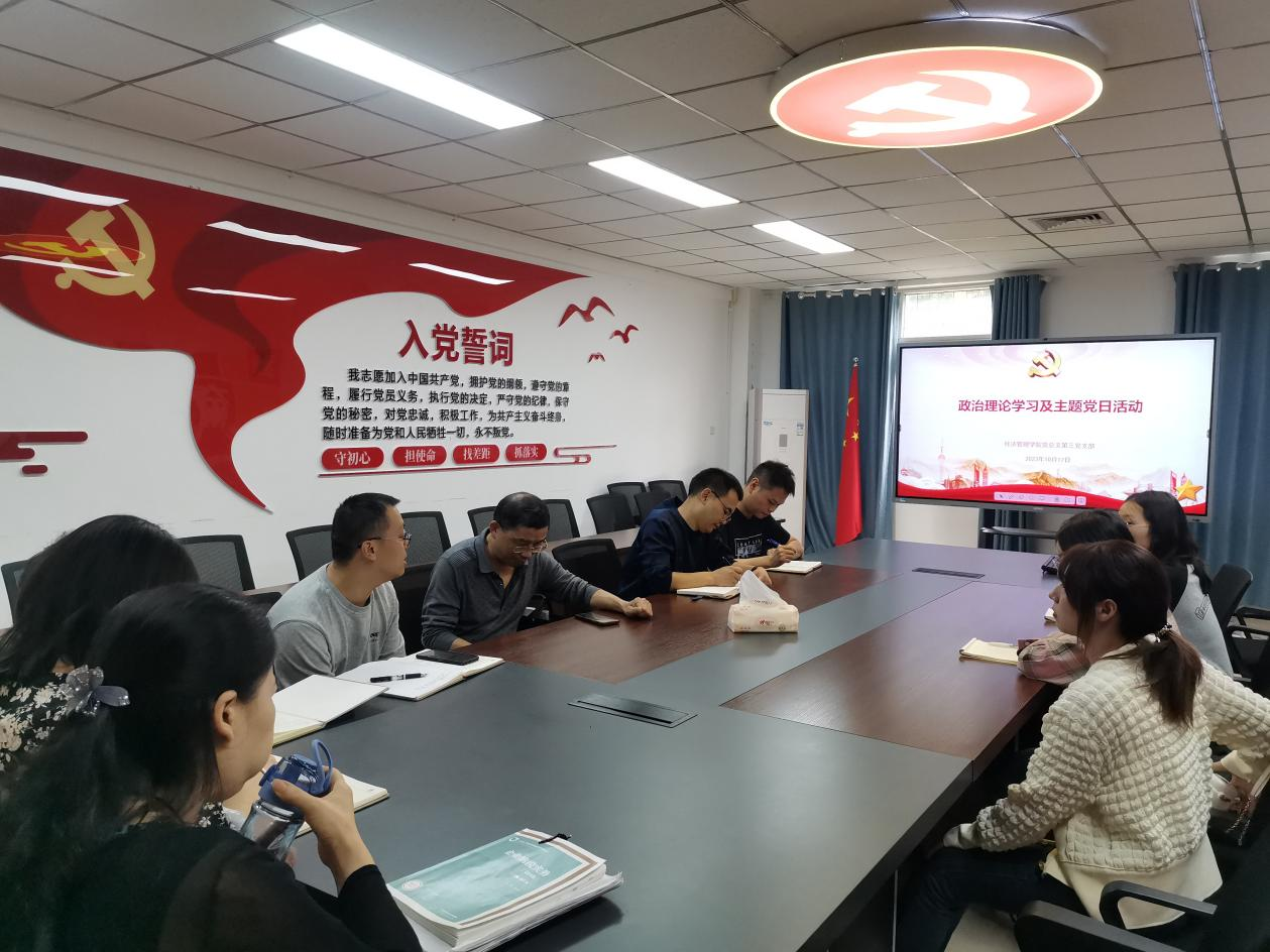 10月18日下午,经济管理学院党总支第三党支部在沙龙校区综合楼二楼会议室开展10月政治学习及主题党日活动,会议由支部组织委员李毅主持,支部全体党员参加学习。