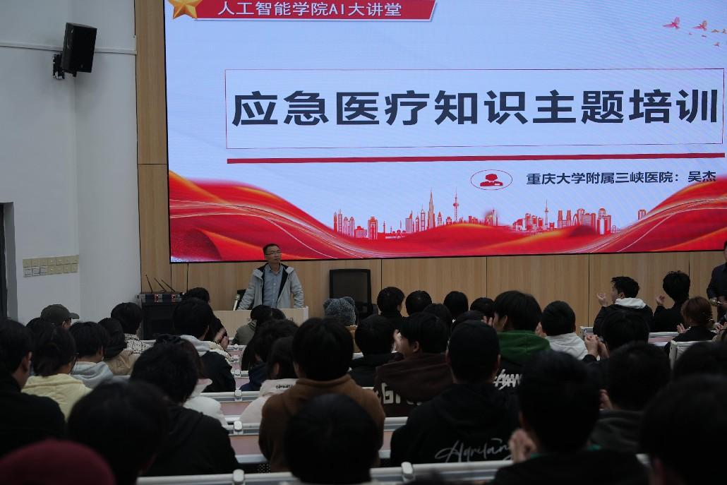 为进一步普及急救知识,提高学生急救本领,11月29日下午,人工智能学院AI大讲堂——“应急医疗知识”主题讲座在信科楼220教室举行。本次讲座由万州区呼吸内科专业医疗质量控制中心专家组成员、重庆大学附属三峡医院呼吸与危重症医学科主治医生吴杰主讲,人工智能学院200余名师生参加本次讲座。