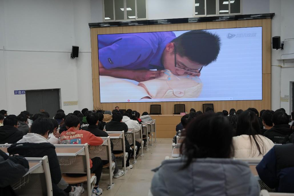 讲座内容涵盖了常见的急救场景与应对方法,吴杰医生从理论讲解和实际操作两部分出发,以案例分析、互动问答、现场演示等方式,详细讲解心肺复苏术的重要性、操作步骤及注意事项。此外,还给同学们演示了伤口包扎技巧、常见突发疾病的早期识别、临时处理措施等。