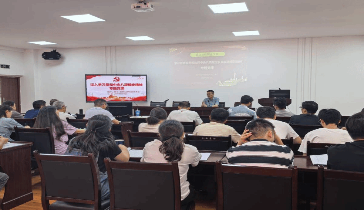 6月19日,智能制造学院党总支书记熊江在奥训楼308会议室讲授深入贯彻中央八项规定精神学习教育专题党课,全体党员参加学习。