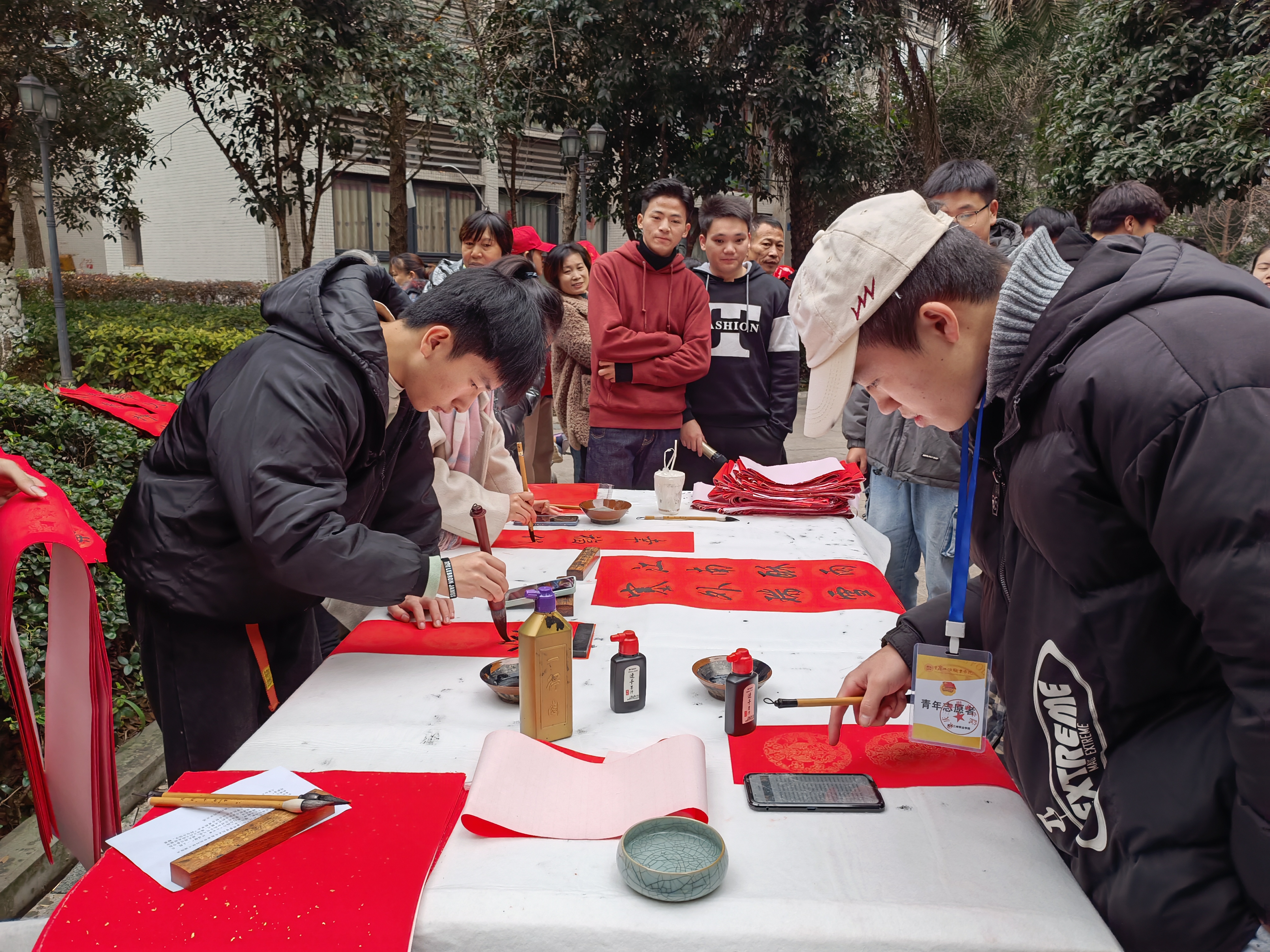 当志愿者们布置好场地后,立刻引起了社区居民的注意,我院志愿者们一展身手,一笔一划顿挫有力,吸引了不少社区居民前来观看。志愿者们铺开红纸、蘸好笔墨、凝神聚气,在红彤彤的纸上,写下了一幅又一幅苍劲有力、潇洒自如的“福”字和春联。许多居民排队领取对联,喜悦之情溢于言表,纷纷为我院学子风采点赞。